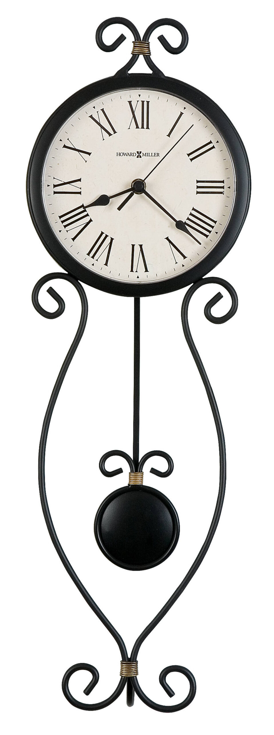 HIGH QUALITY: The circle design will ensure you can read the time anywhere in the room. Easily tell time with black traditional Roman numerals (IIII instead of IV), black spade hands, antique black bezel, and convex crystal to stand out over an aged dial. The black pendulum bob is suspended on a bent wire with a gold accent.