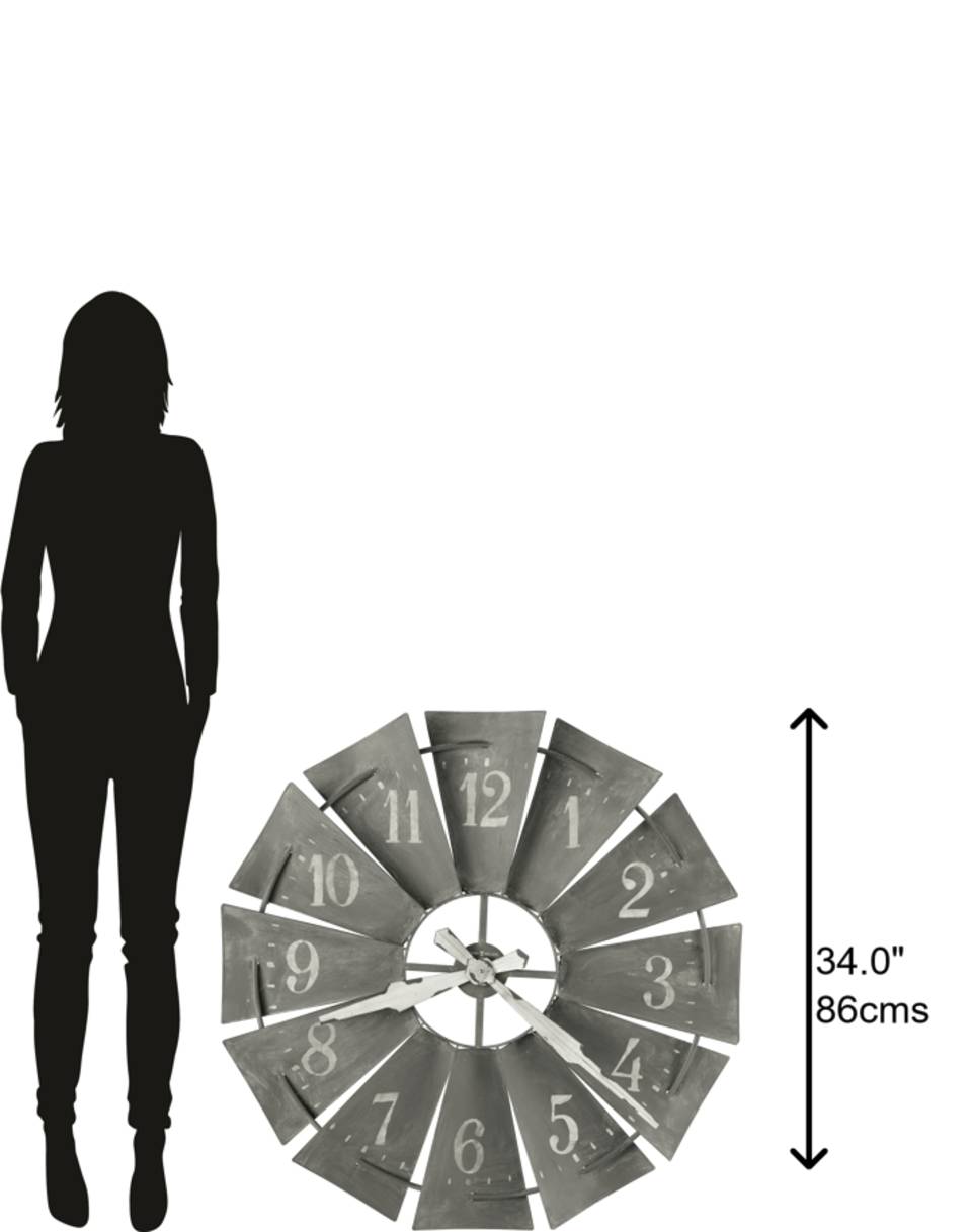 Antique Styling: This oversized windmill style metal wall clock features an antique brownish charcoal finish and significantly aged white hour and minute hands. Together all of these tiny details work to create a unique aged look. This metal wall clock is the perfect addition to any farmhouse style collection.