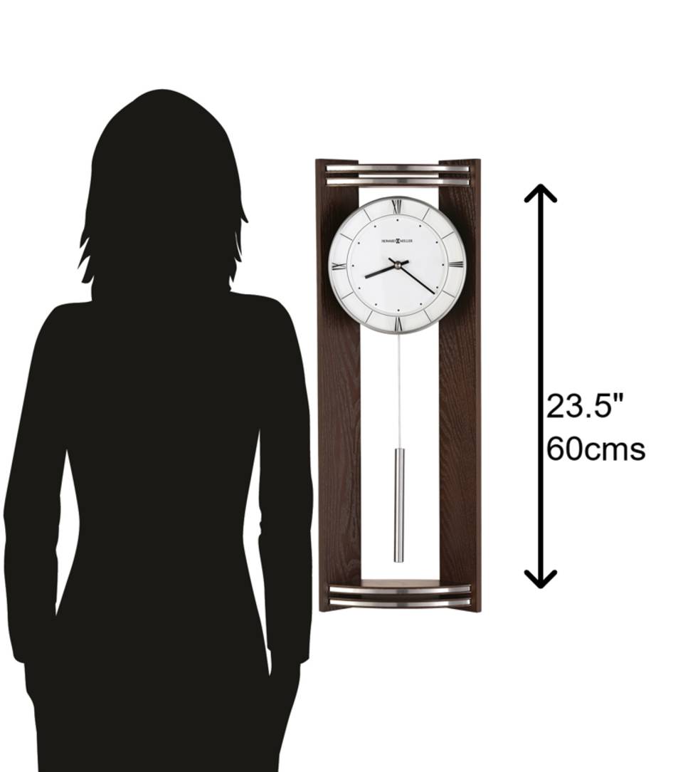 Behind the Aesthetic: Attention to detail, superior materials, and masterful workmanship set this wooden wall clock apart. Made with warm wood in a shade of deep black coffee, it has angled side panels bolstered by additional panels at the top and bottom. Each of those is beautifully enhanced with a pair of decorative bands in a satin silver finish. At its heart is an eye-catching white dial with a recessed center. The square hour markers and black hour and minute hands offer a touch of contrast, while sleek Roman numerals and bar-style hour markers grace the glass crystal front. The perfect finishing touch is an exquisite pendulum that hangs gracefully below. It features a silver-finished cylindrical bob and a round stick accent.