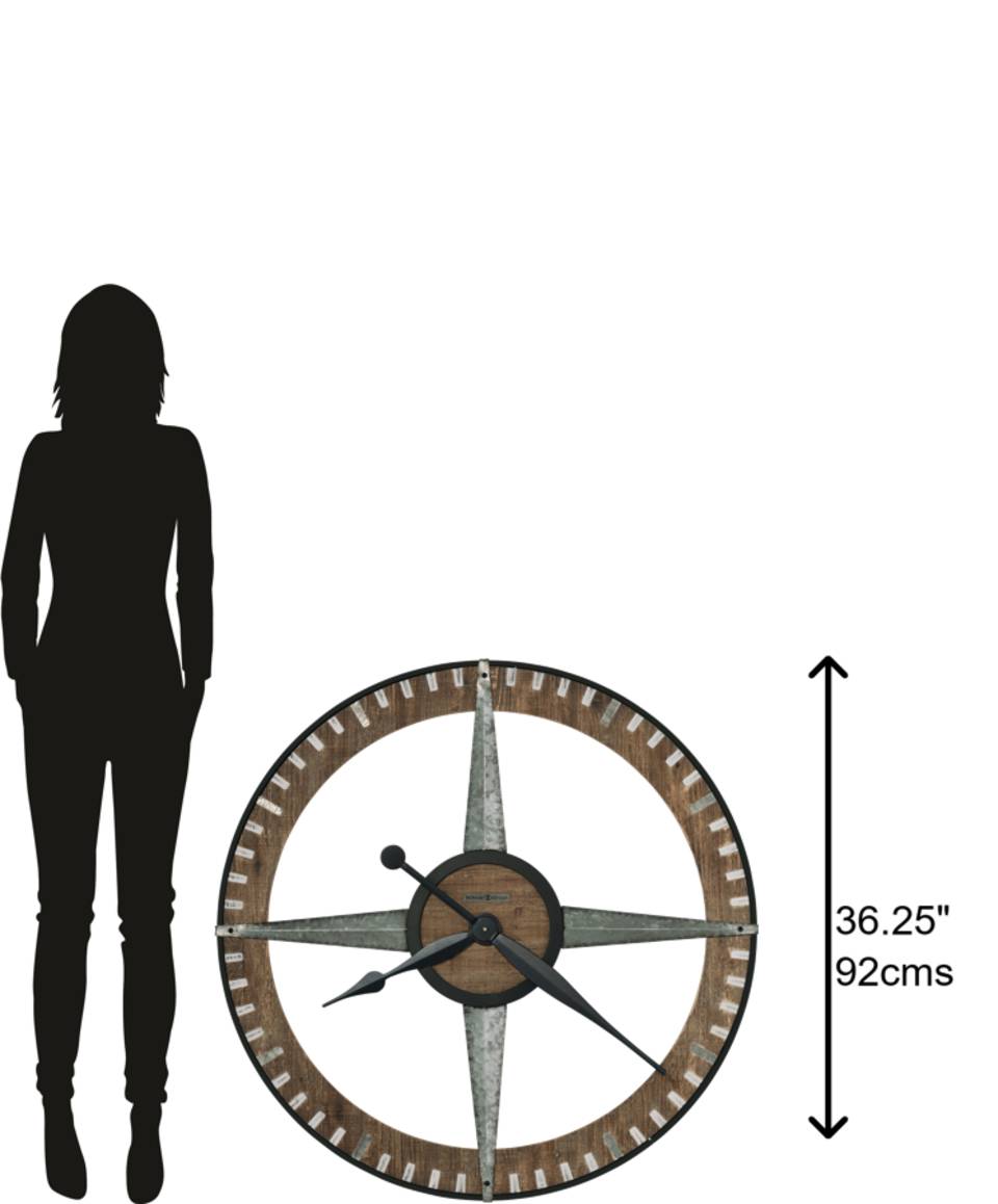 Perfectly Detailed: Thae details bring it all together on this large wall clock. Beginning with a metal frame finished in charcoal that encircles a distressed wooden ring, the design is neatly supported by tapered and galvanized steel. The effect is mirrored in the center, where a smaller wooden disk is framed by charcoal-finished metal. Rectangular galvanized steel plates accent every hour, while the minute markers are finished with light gray paint. The bold finishing touches are the hour and minute hands, both completed in rich charcoal. The effect is perfectly cohesive throughout.