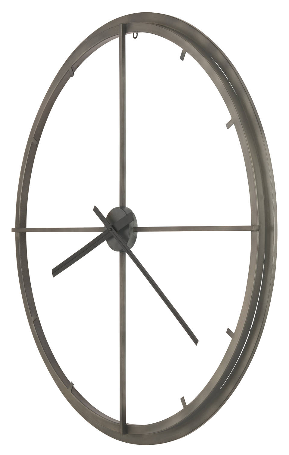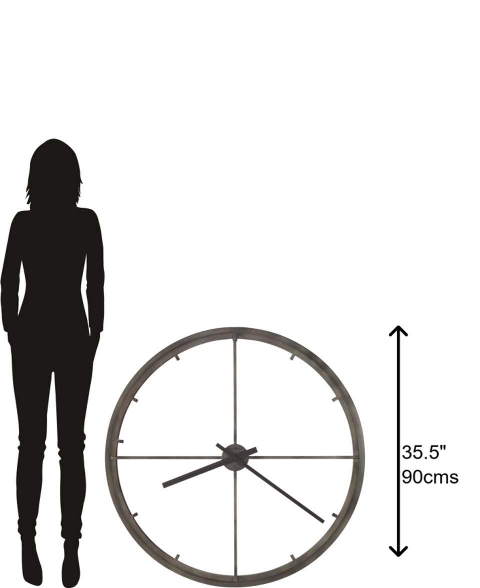 Everlasting Beauty: Such an enduring appeal is evident in the construction of the piece. From top to bottom, this large wall clock exudes a commanding presence. It’s made with sturdy, durable metal that boasts an aged charcoal finish. The technique lends it a properly antiquated look, yet with its open workmanship and scaled-back design, it also introduces a touch of modernity to the room. The bar-style hour markers are affixed to the outer frame, while aged charcoal minute and hour hands complement the overall color scheme.