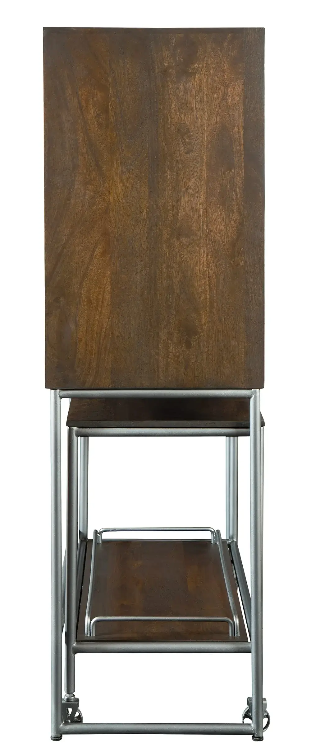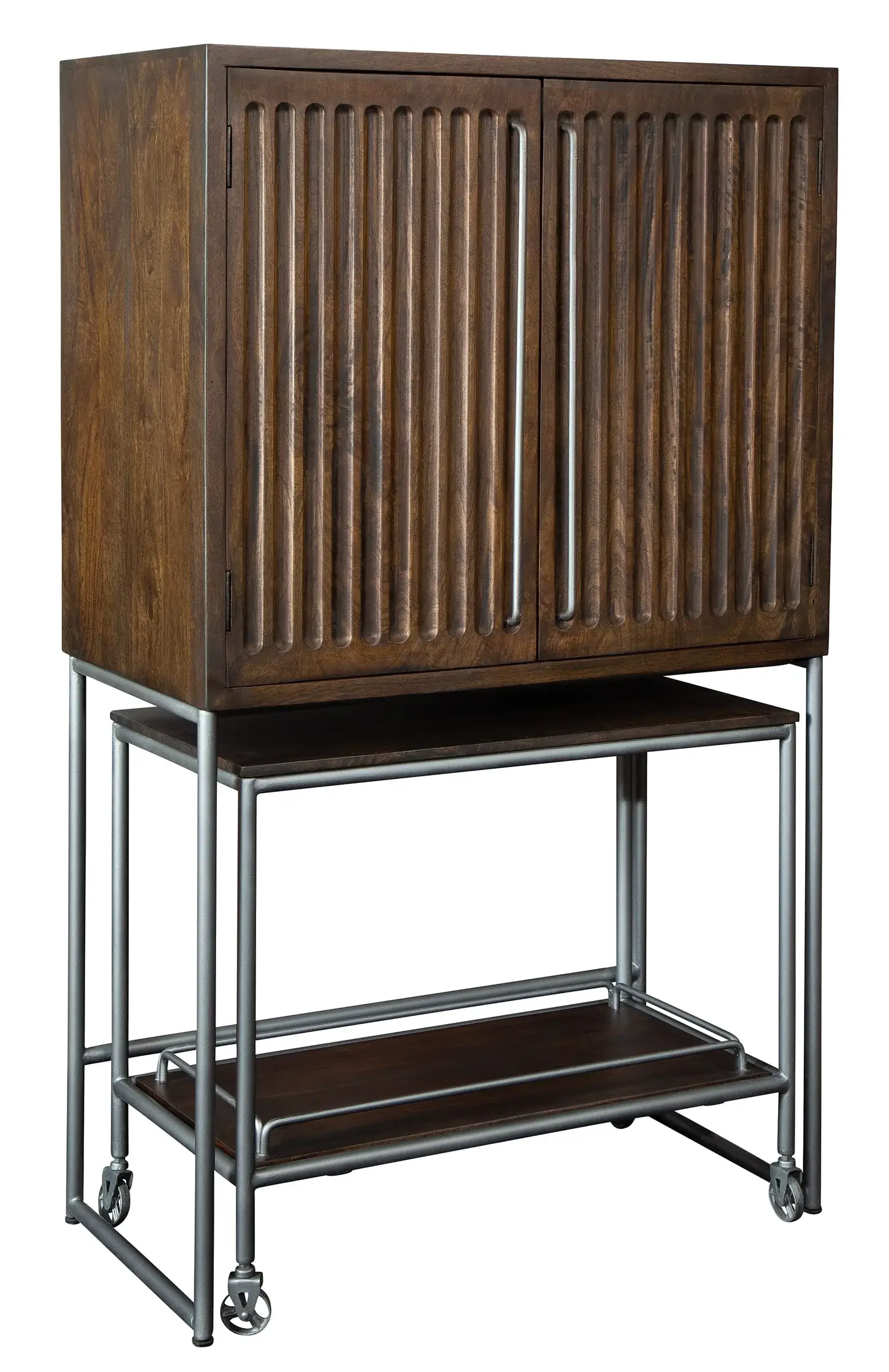 - A portable, metal wine serving cart—which measures Height 30" (76 cm), Width 35" (89 cm), and Depth 18" (46 cm)—nests in the base of this cabinet and includes a wood top, a lower wood shelf with metal wire galley, and four casters for mobility.