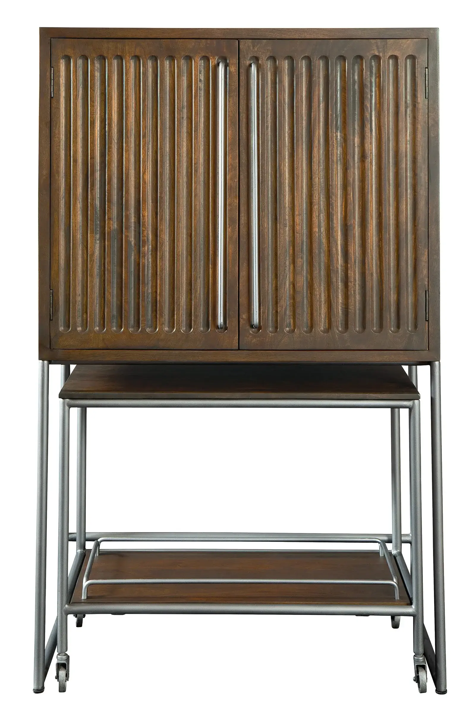 - Two hinged doors with distinctive fluting and elongated metal pull.