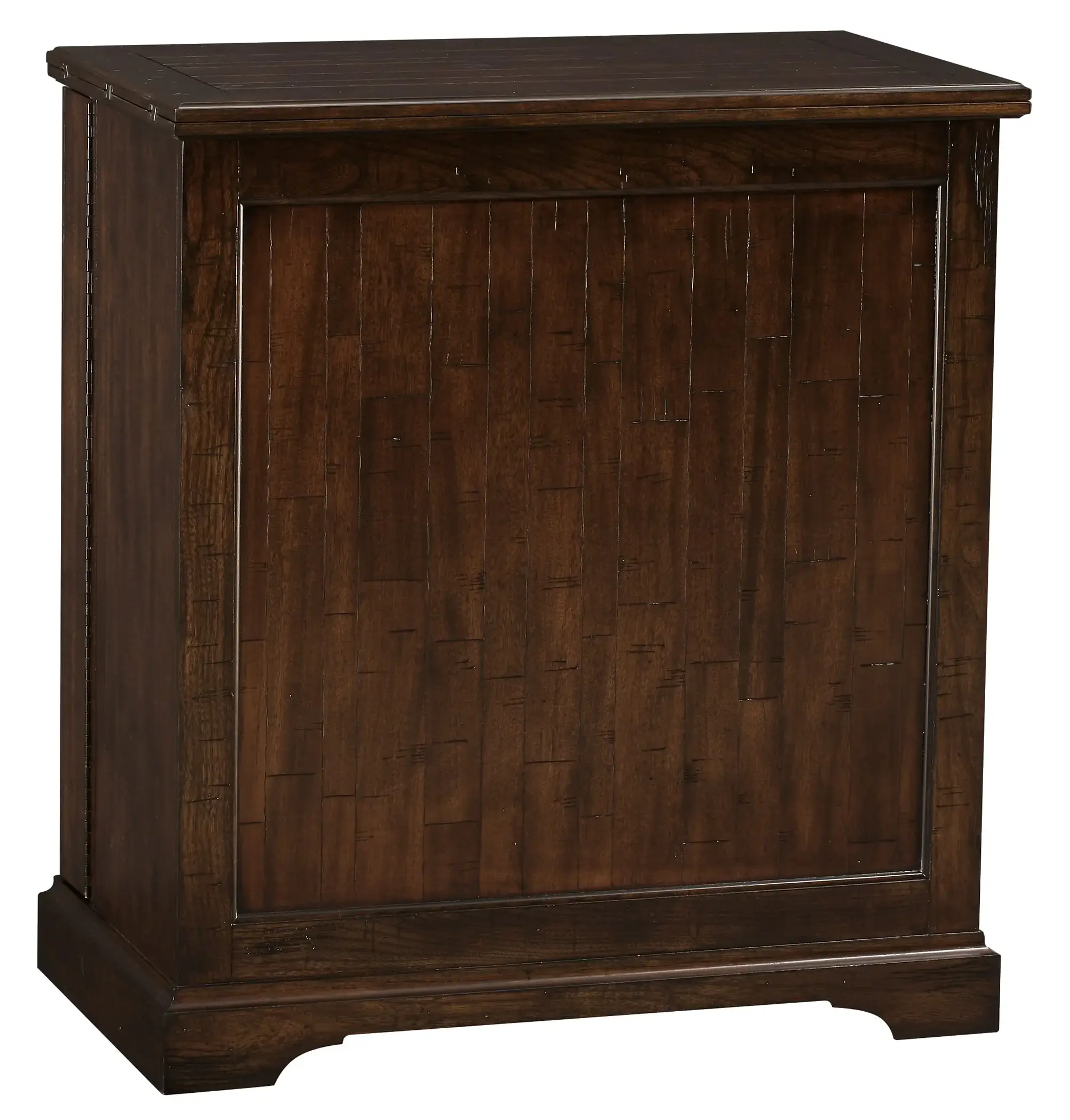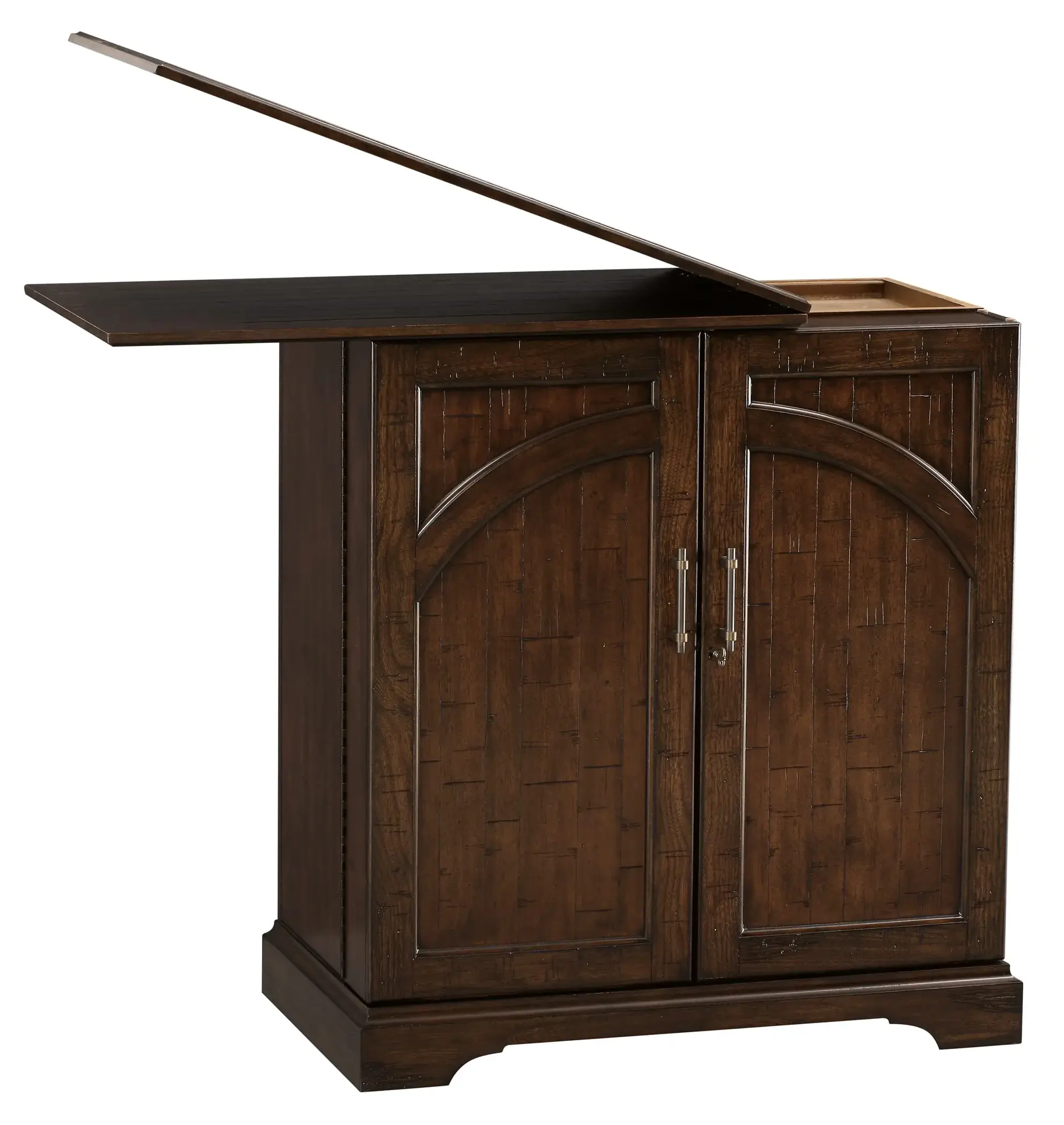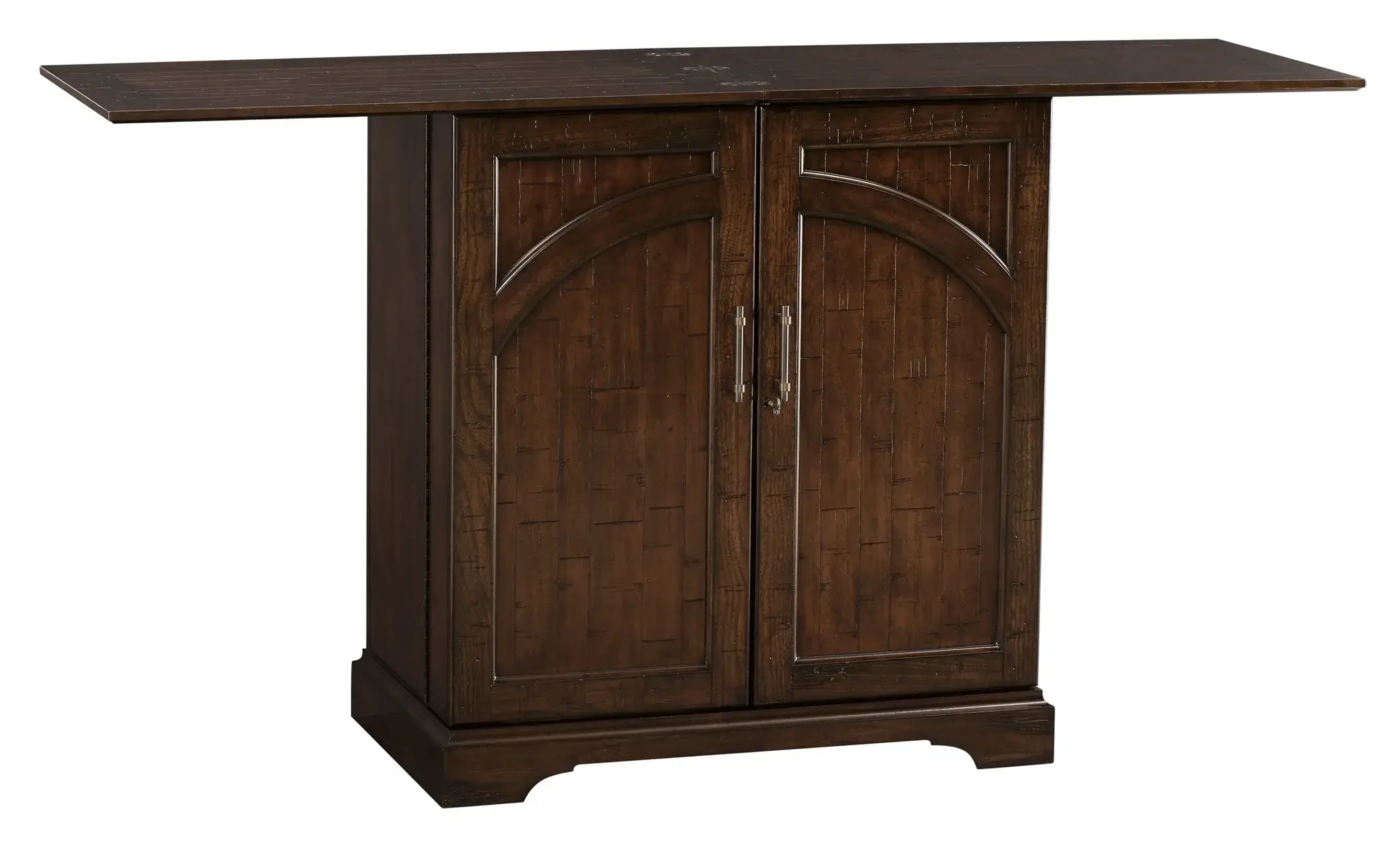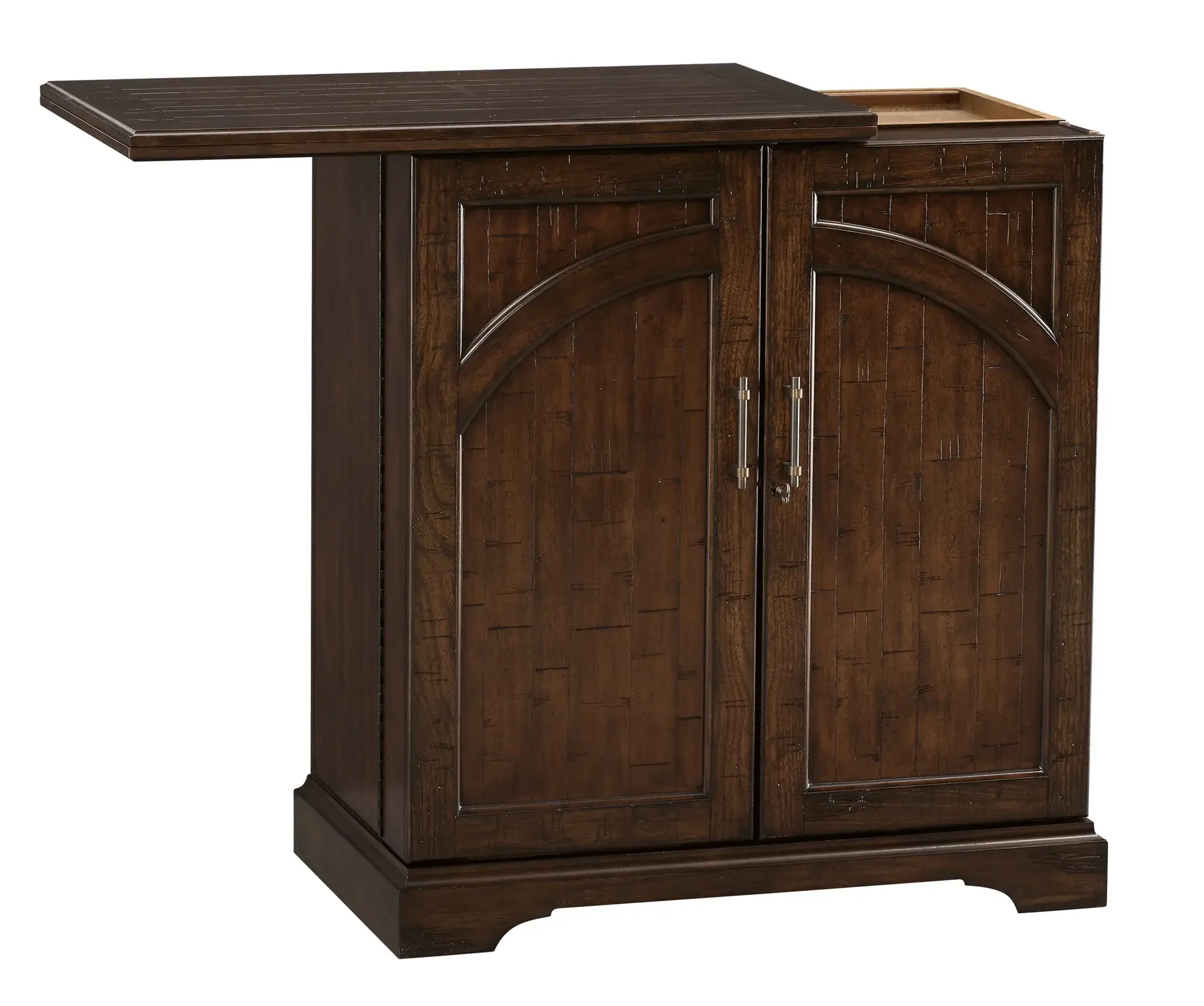 - This portable, Hide-a-Bar cabinet is finished on all sides and features decorative raised panels on the two front doors and on the back.