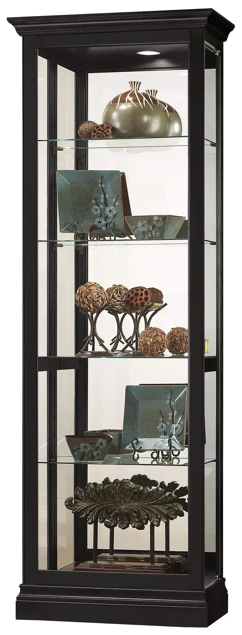 Illuminated Interior: Inside this black curio cabinet is a light for illuminating your treasures. It has a No-Reach™ roller light switch on the back of the cabinet, so it’s easy to turn the light on and off.
