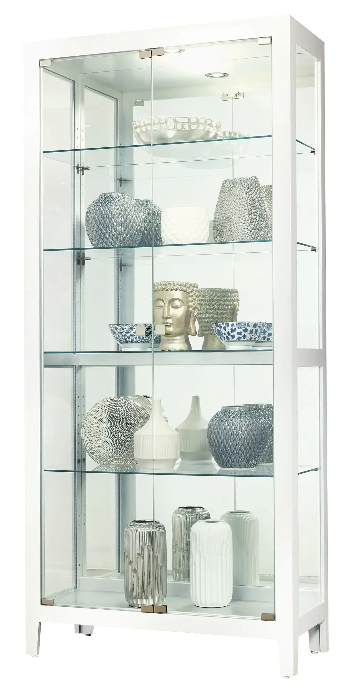 - Flat top curio features hinged glass doors with brushed nickel hinges and doorknobs.