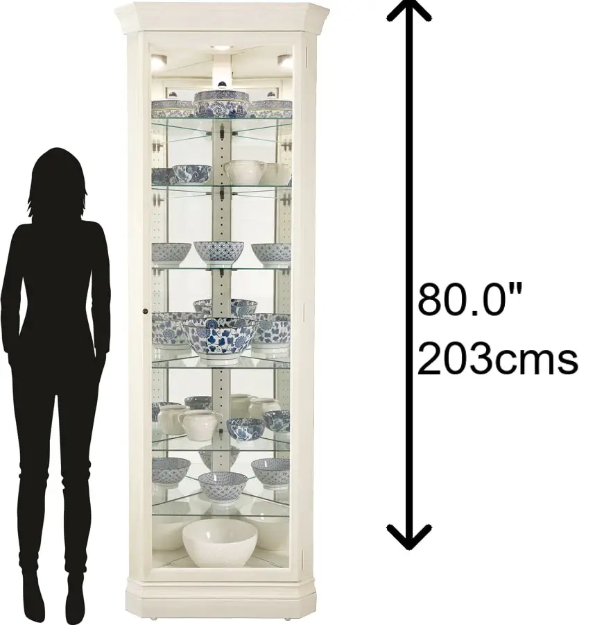 Six Glass Shelves: total of seven display levels are provided by this lighted curio cabinet. The shelves are adjustable, and they lock into place with Pad-Lock™ cushioned metal shelf clips to prevent slipping. This curio cabinet has a glass mirrored back for an enhanced view of the items inside.