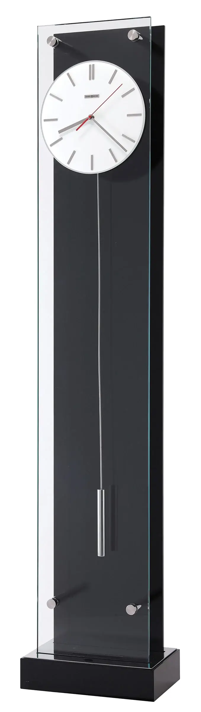 Sleek Style: The glass and metal construction of this pendulum grandfather clock imparts contemporary style to your living room. This all-glass grandfather clock has a black back panel, which contrasts with the stainless-steel-finish slim cylindrical pendulum.