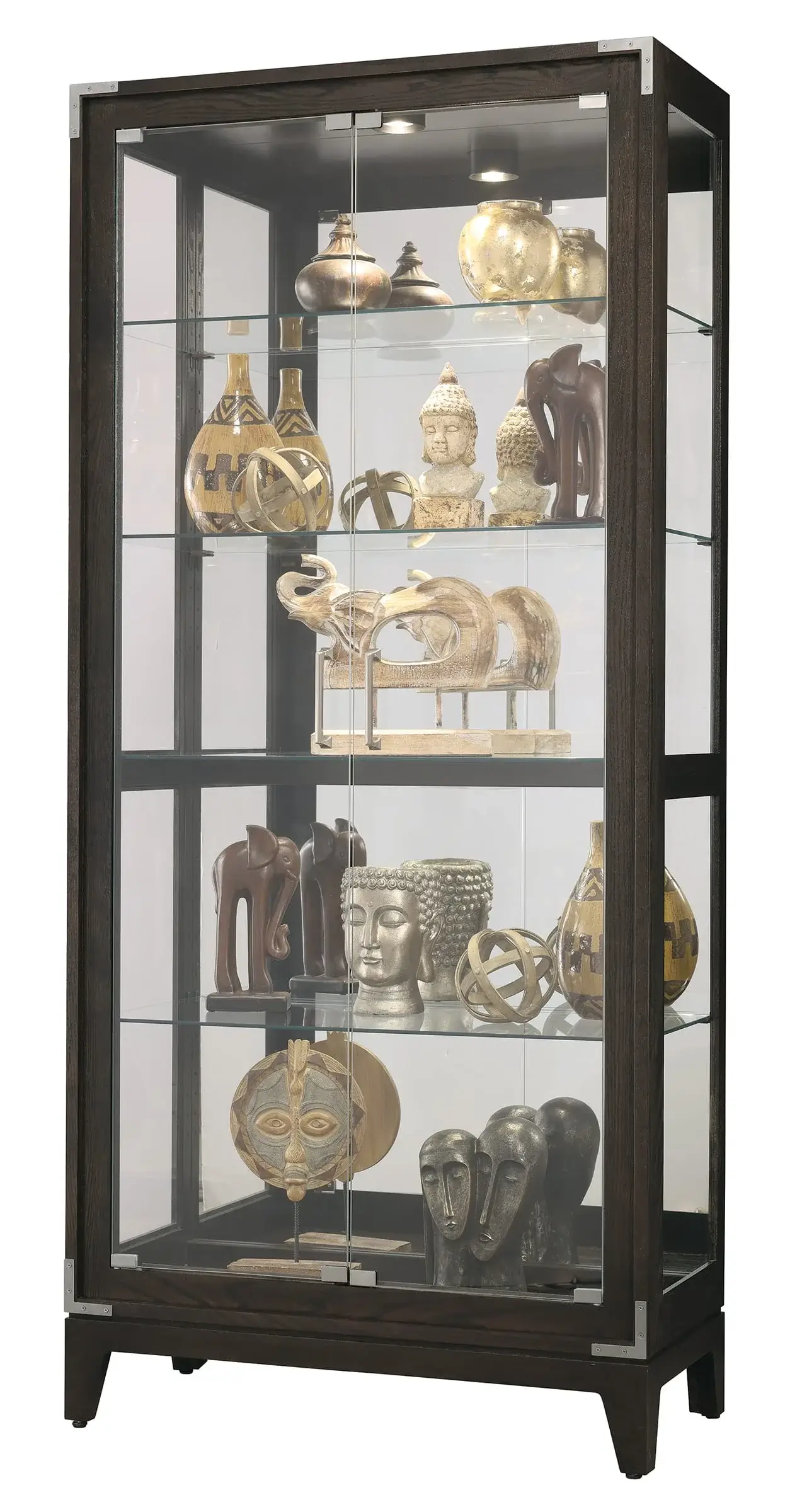 - Four adjustable glass shelves allow for five levels of display. Continuous holes for shelf adjustment.