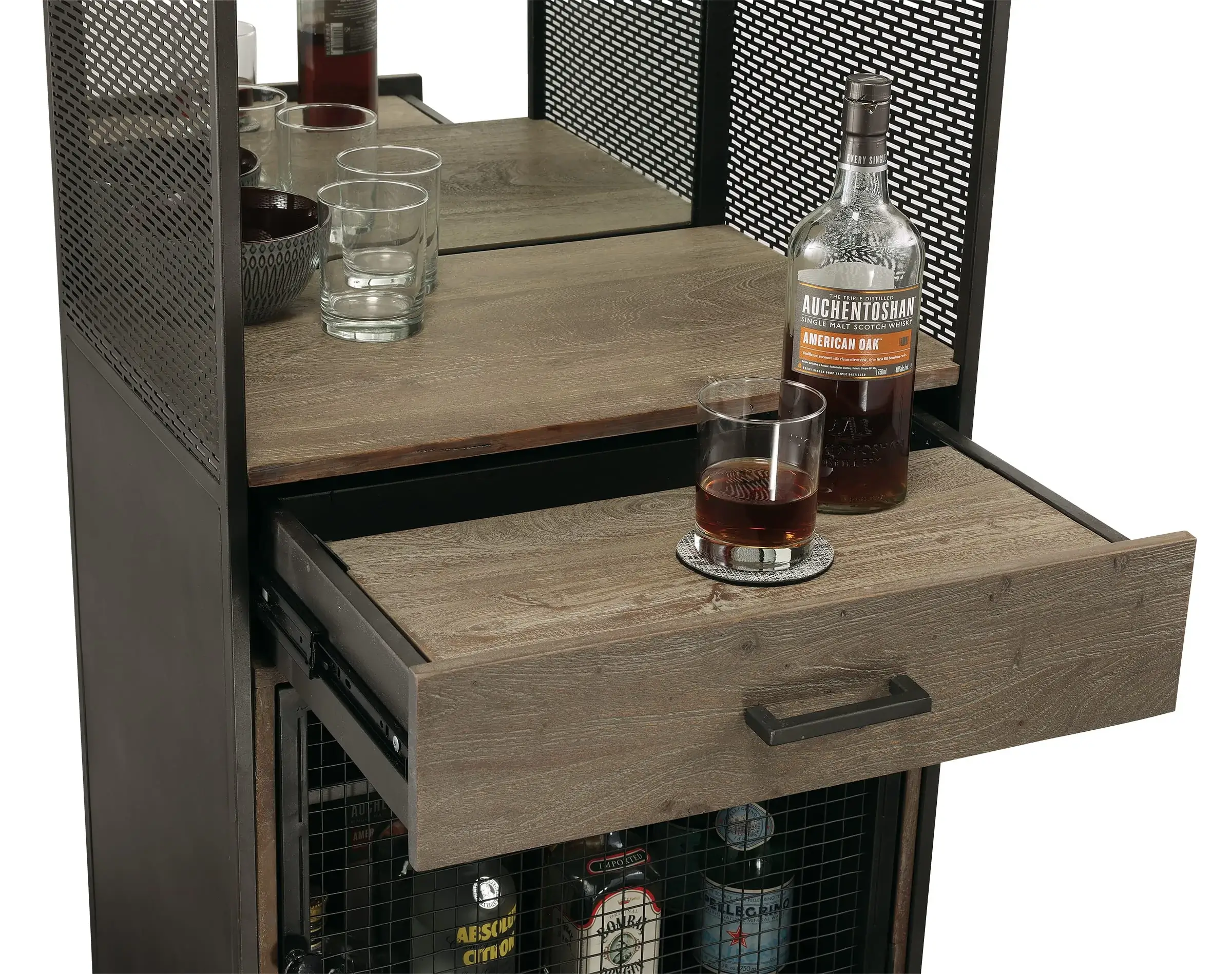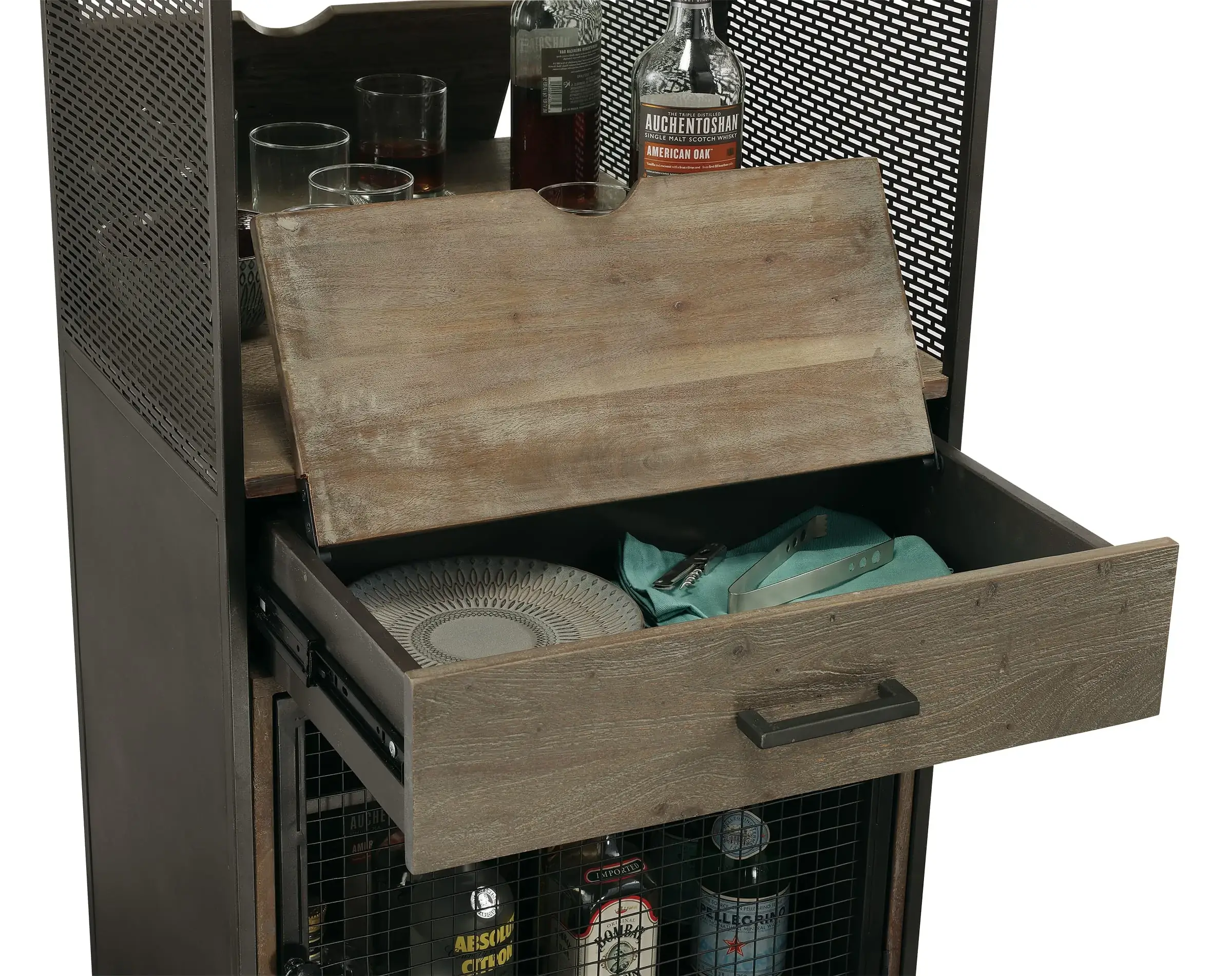 - Hinged metal door with metal wire grille. Two fixed wood shelves behind the door for liquor and glassware storage.