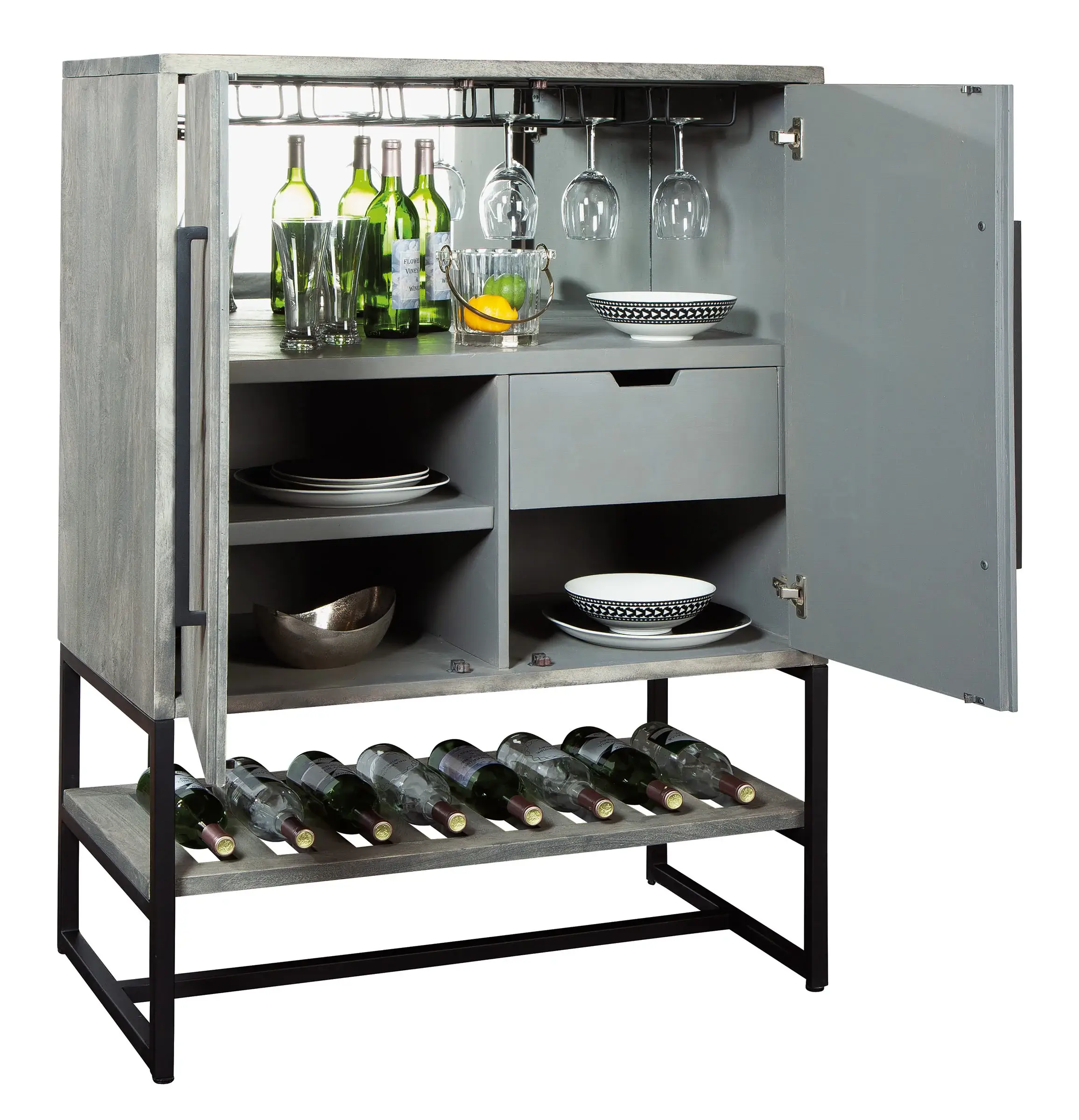 - The upper interior of the cabinet includes a glass mirrored back panel and a hanging metal stemware rack that holds up to 18 large wine glasses.