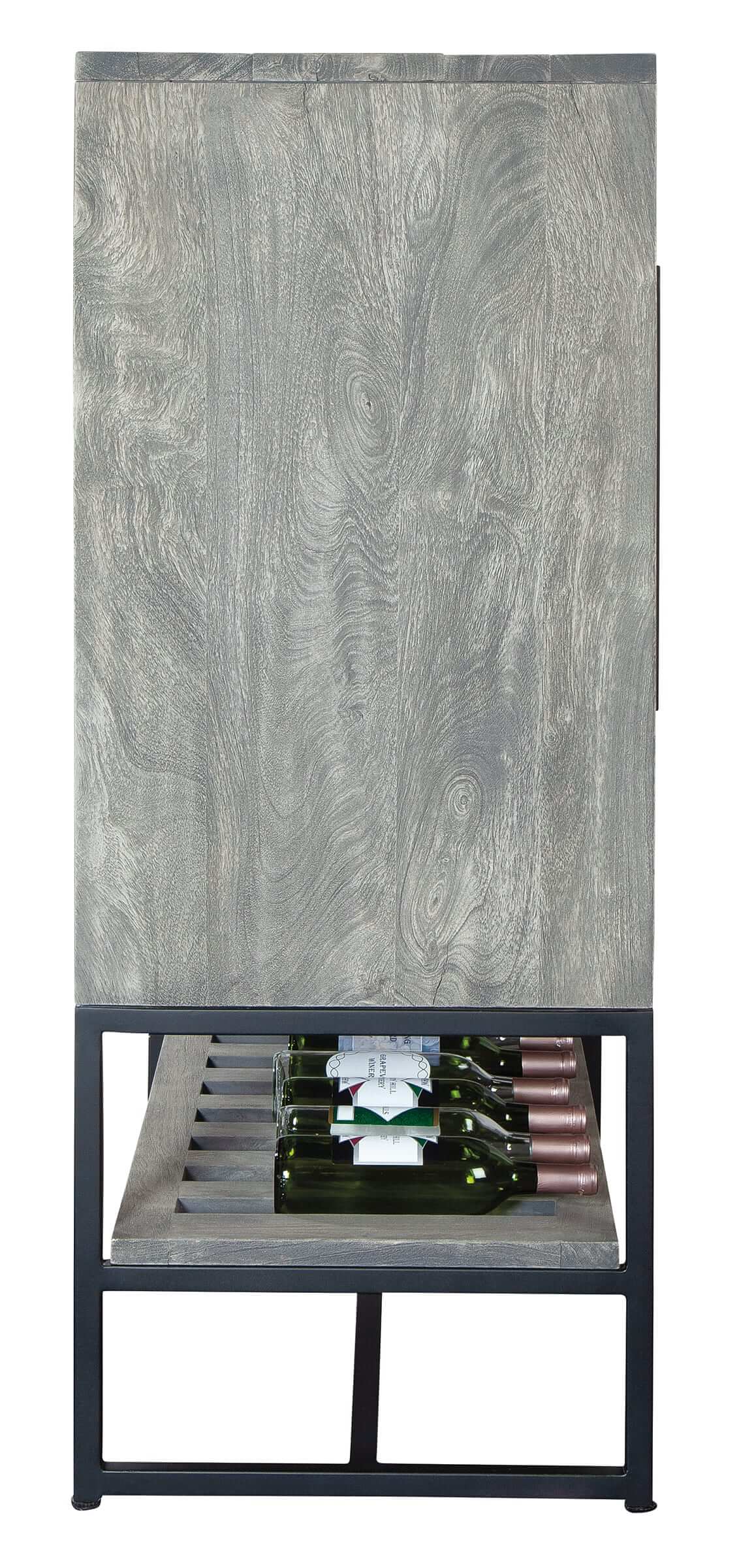 - A fixed lower shelf in the base of the cabinet features slats and allows for wine storage.