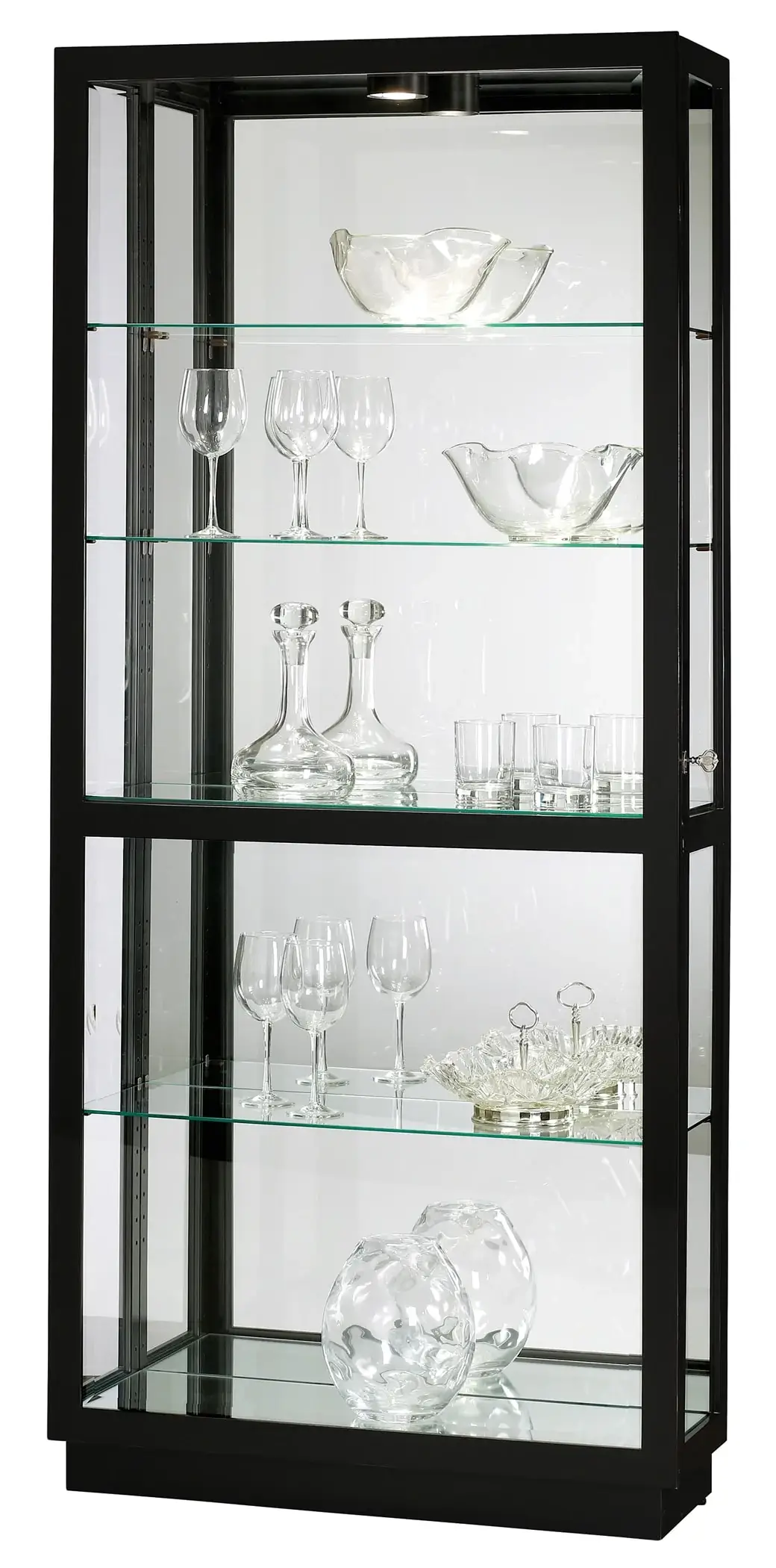 Adjustability: Adjust this black curio cabinet as needed. The four adjustable glass shelves allow for five levels of display with continuous holes for shelf adjustment. The Pad-Lock™ cushioned metal shelf clips increase stability and safety, while the adjustable levelers under each corner provide stability on uneven and carpeted floors.