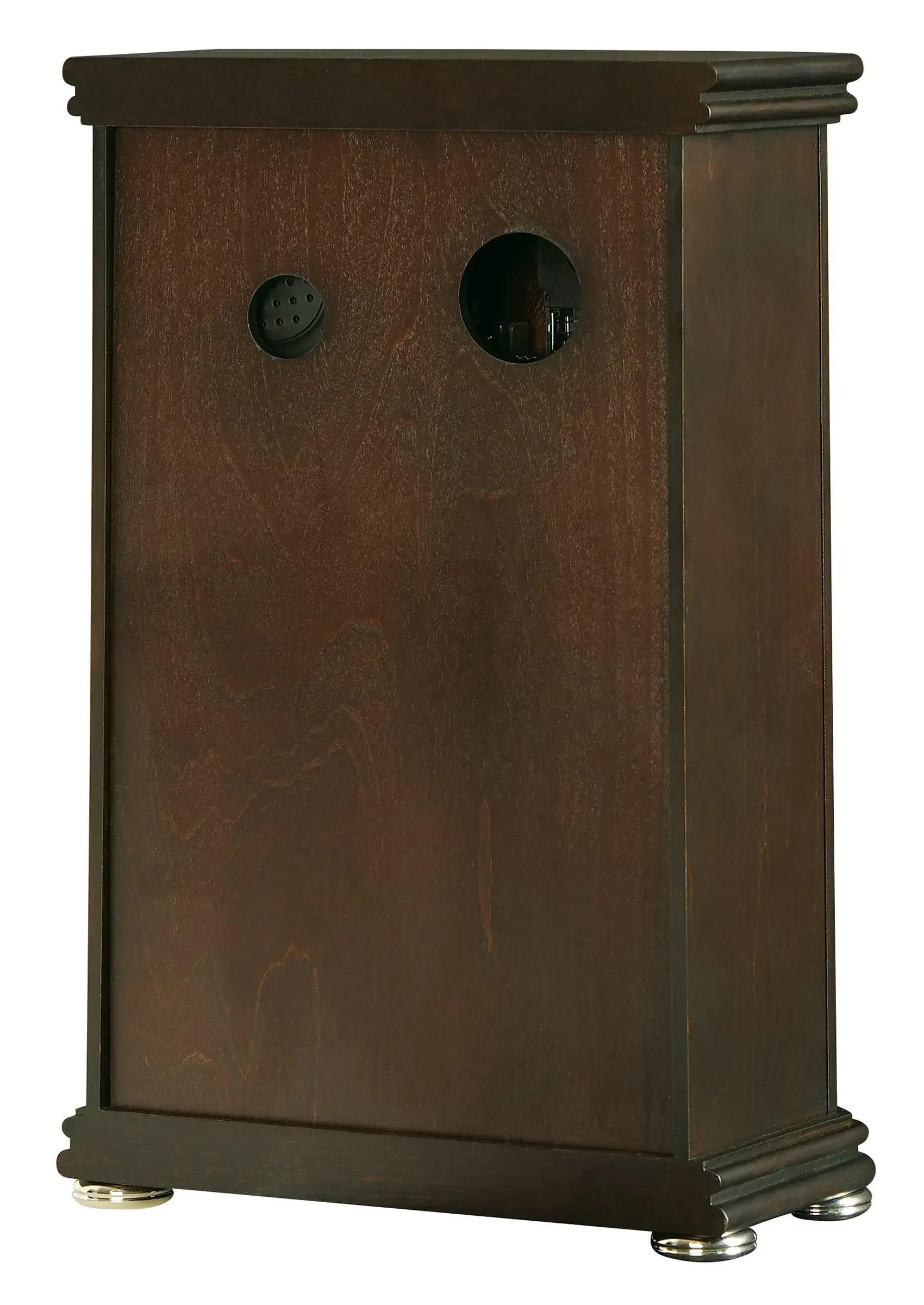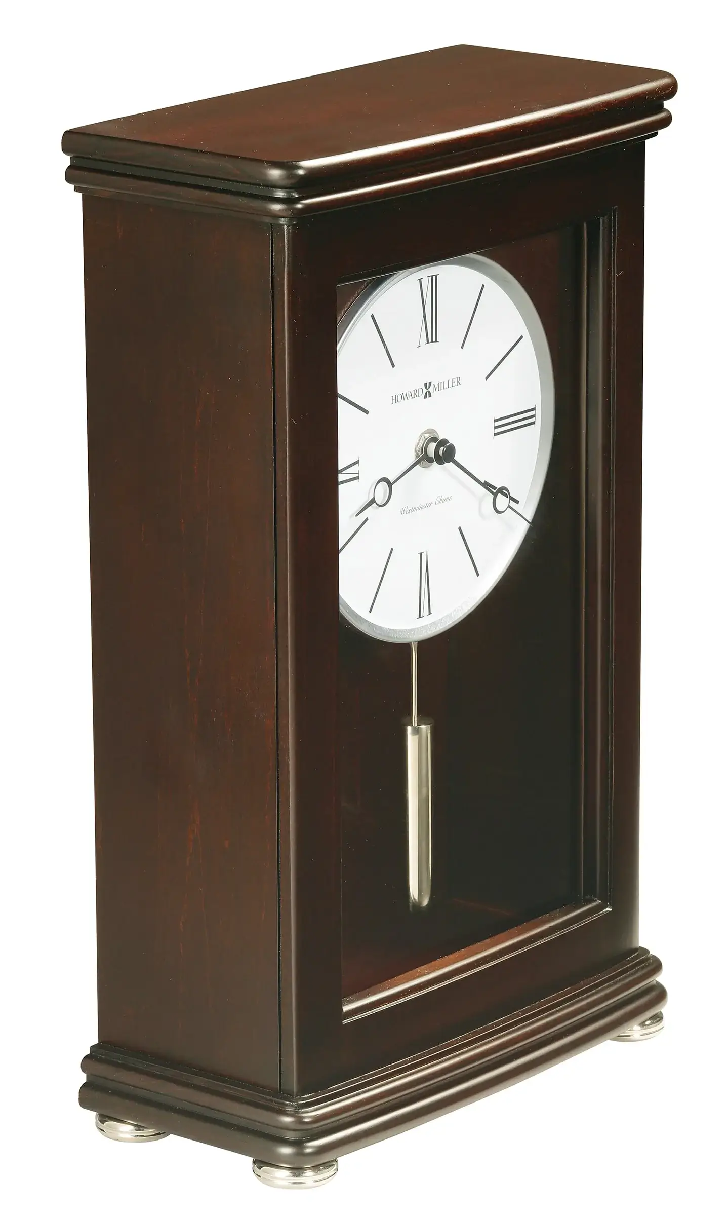 Careful Craftsmanship: Enjoy the detailed craftsmanship of this Howard Miller modern mantel clock. The mantel clock features an espresso finish on select solids and veneers with a slightly curved front, rounded corners, and polished nickel finished bun style feet.