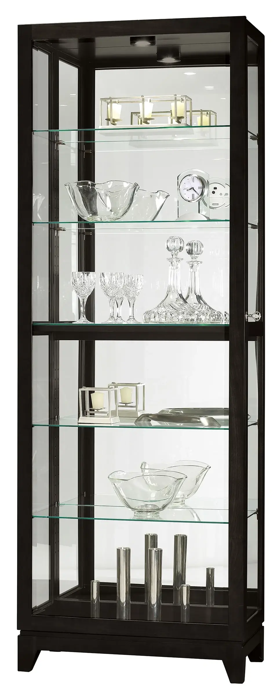 Five Adjustable Shelves: Inside this glass display cabinet are five glass shelves, which have continuous holes for easy adjustments. When all five shelves are in place, there are six display levels you can use. Pad-Lock™ cushioned metal clips ensure the shelves stay in place.
