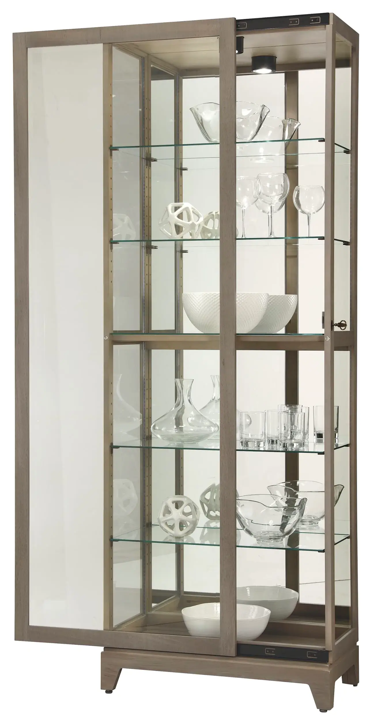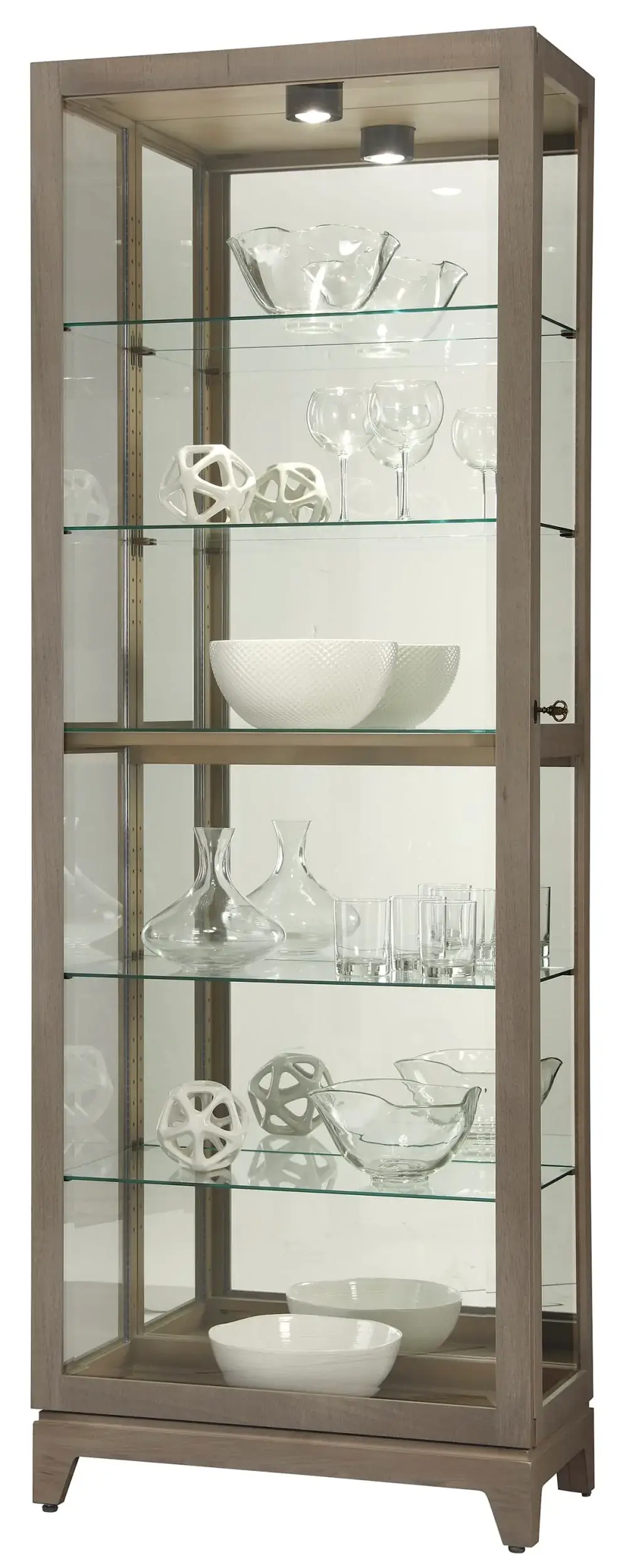 Select Hardwood Construction: This curio cabinet is made from select hardwoods and veneers for durability and style. It has a wire-brushed Aged Gray finish that mimics the weathered appearance of reclaimed wood, along with a glass mirrored back for contemporary flair.