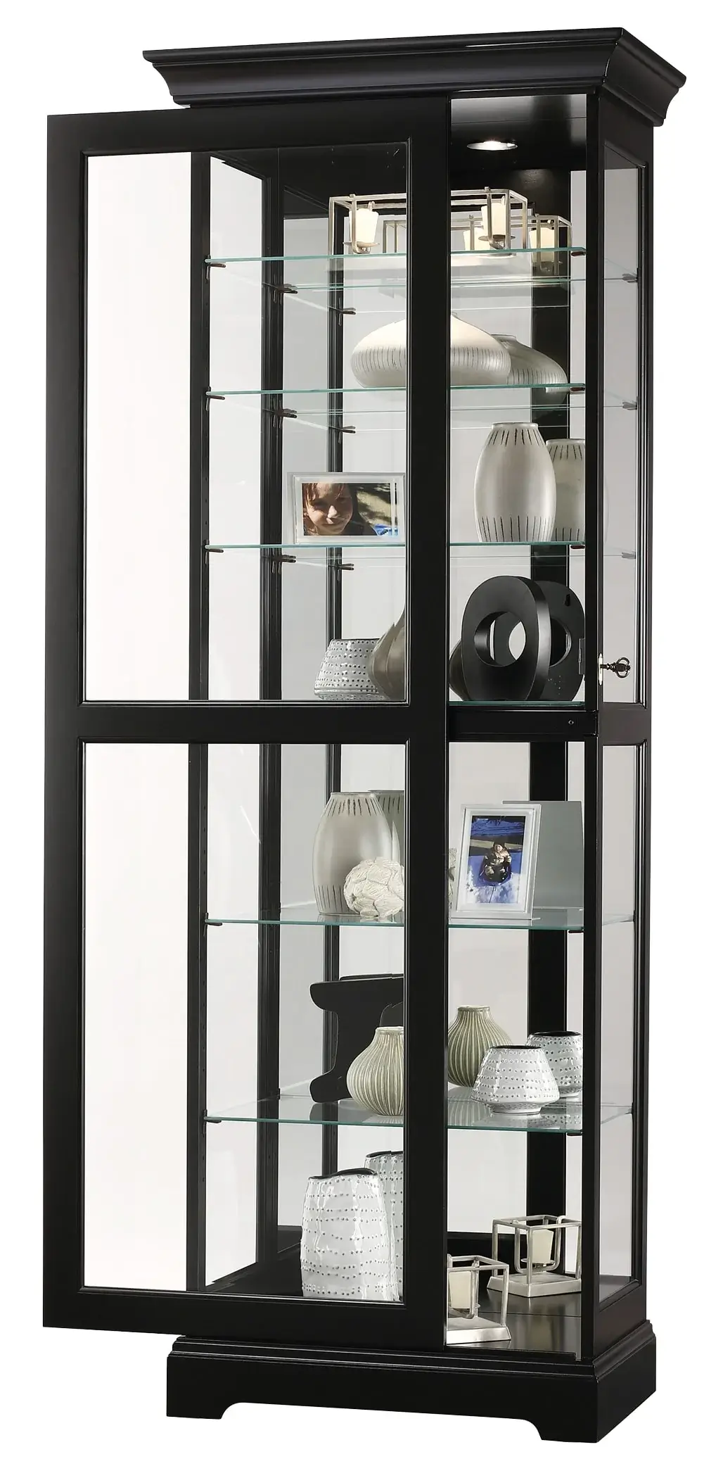 Detailed Design: No detail was forgotten in the design of this black curio cabinet. Beveled glass on the front door offers a classic design with ample display space on six glass shelves for seven levels of display. Finally, a glass mirrored back beautifully showcases your collectibles.