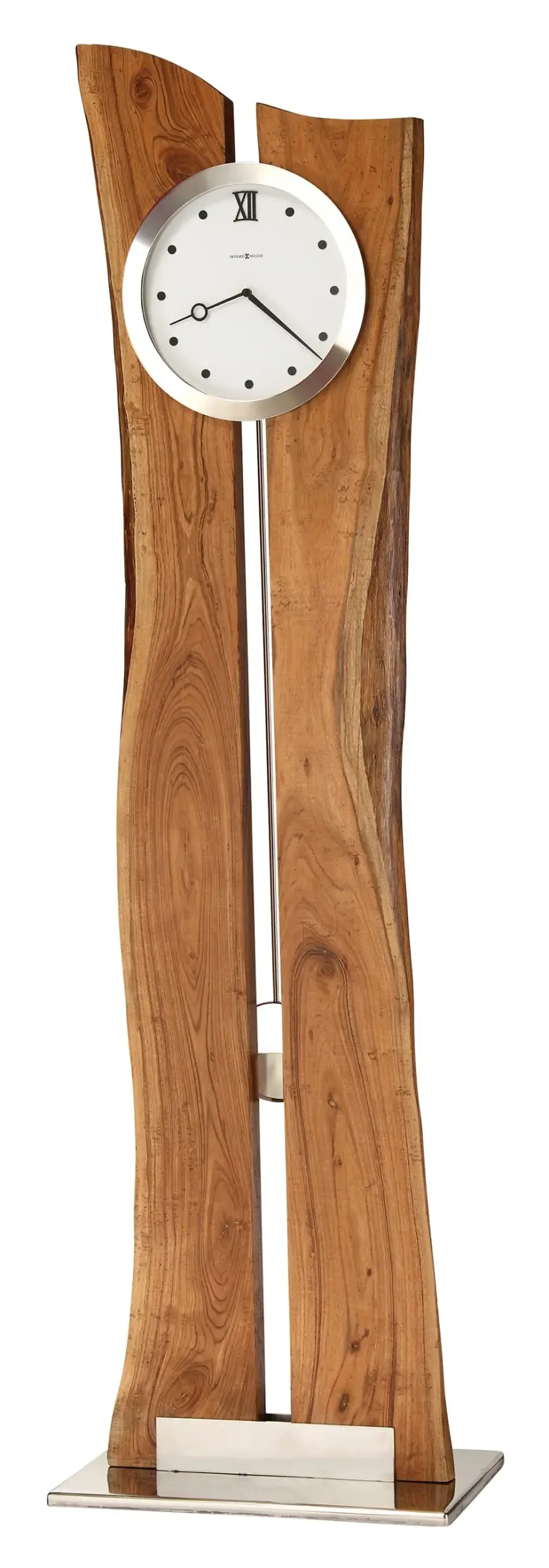 Contemporary Craftsmanship: This unique wooden grandfather clock design combines two rustic live edge wood slabs with modern polished nickel-finished metal accents featuring machine marks.