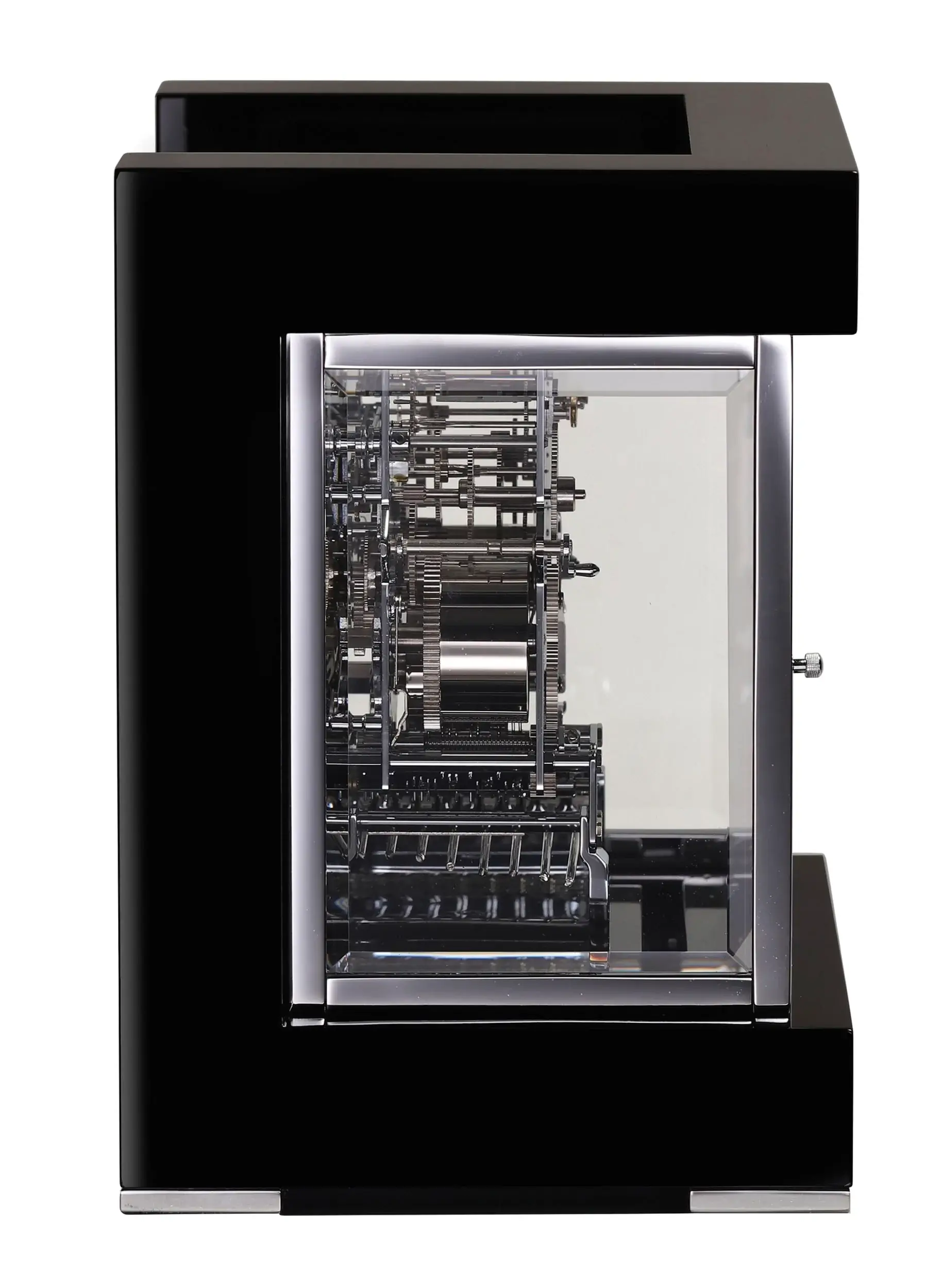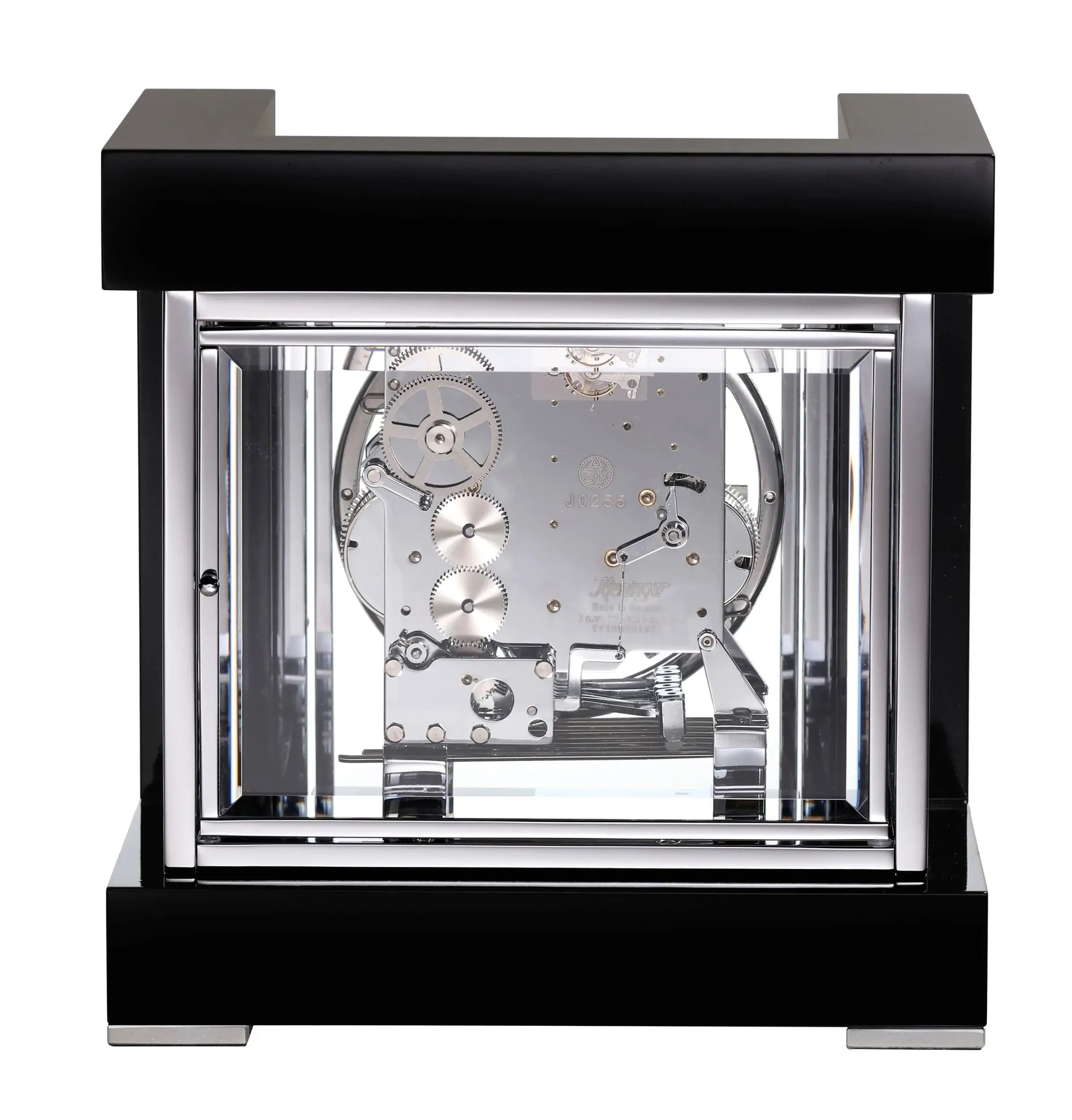 - This limited edition key-wound mantel clock features a hand-rubbed, highly polished Gloss Black piano finish accented by polished chrome-plated brass and polished chrome-plated brass feet. The highly reflective shine and luster of the chrome case is the result of extensive polishing operations.