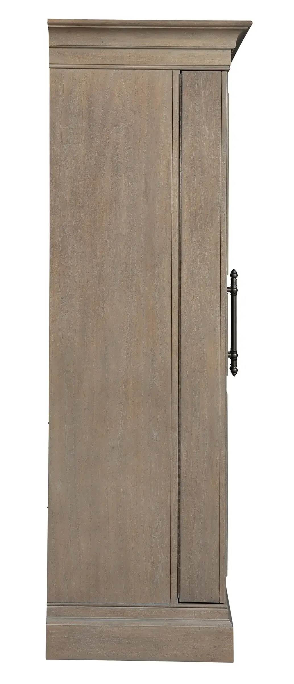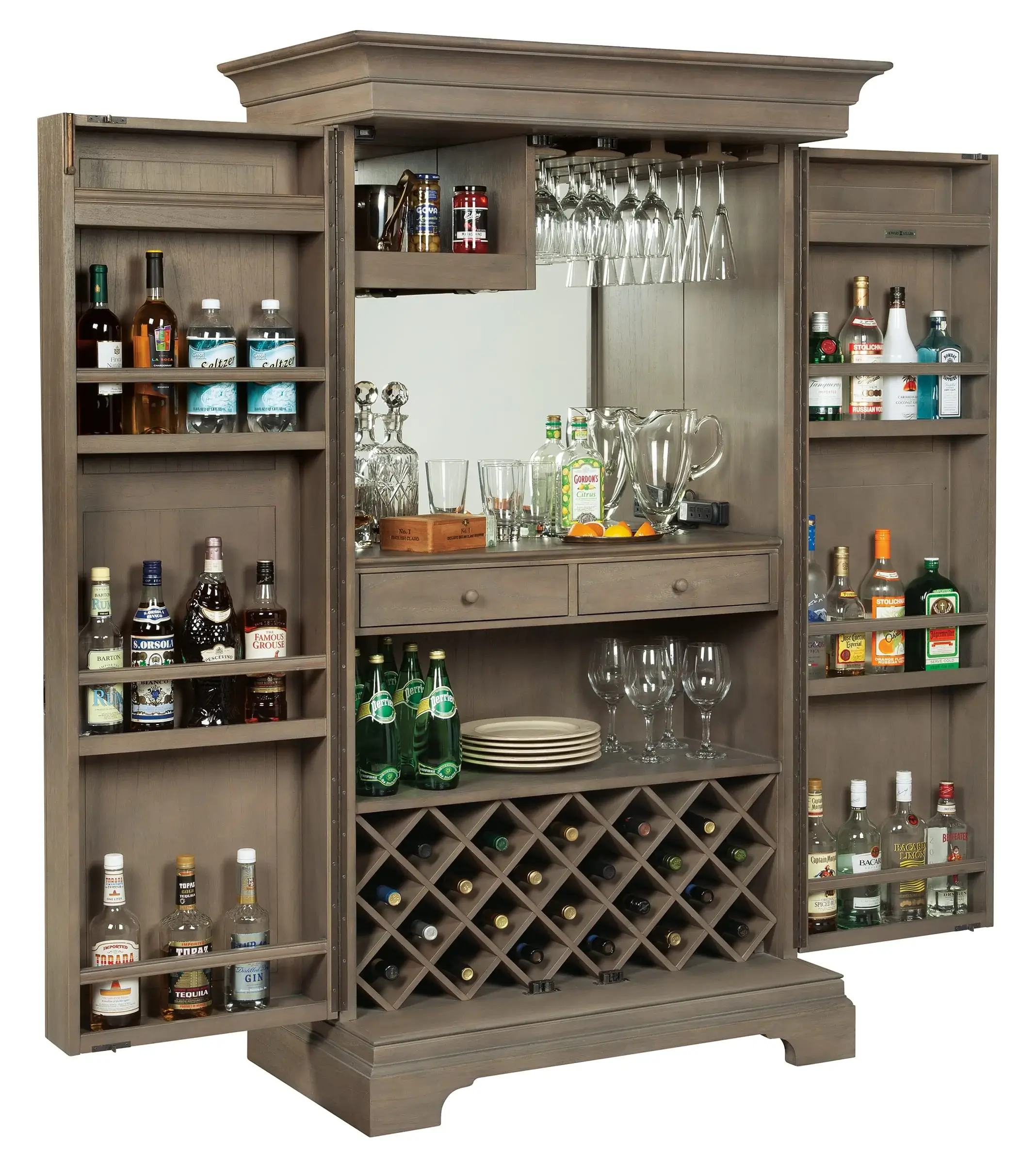 Dignified Style: The exterior of the wooden bar cabinet has an aged gray, slightly distressed finish on select hardwoods and veneers and front locking doors with charcoal gray large bar pulls. The Hide-A-Bar ™ design offers storage for up to 22 wine bottles at its base and several liquor bottles in the doors, which can be secured with a slide lock on the upper interior. The doors of the woodland bar cabinet are mounted on 180° full-length piano door hinges, enabling them to open wide for easy access and use. The cabinet features an Auto-On™ light switch, wooden stemware racks, a glass mirrored back, an upper fixed shelf, two dovetail drawers with laminated lift-up shelves inside, and a power strip for your small appliances.
