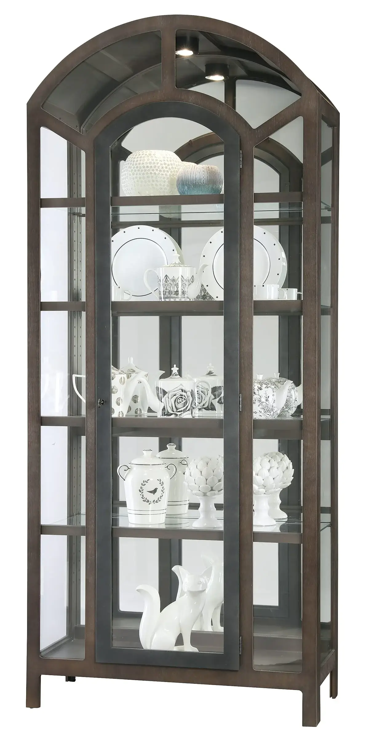 Elegant Details: The glass side and upper inset panels let plenty of light stream through this lighted curio cabinet, which is equipped with a No-Reach™ roller light switch on the back. The hinged door has a stylish charcoal-finish, and a glass mirrored back provides a full view of the cabinet’s interior contents.