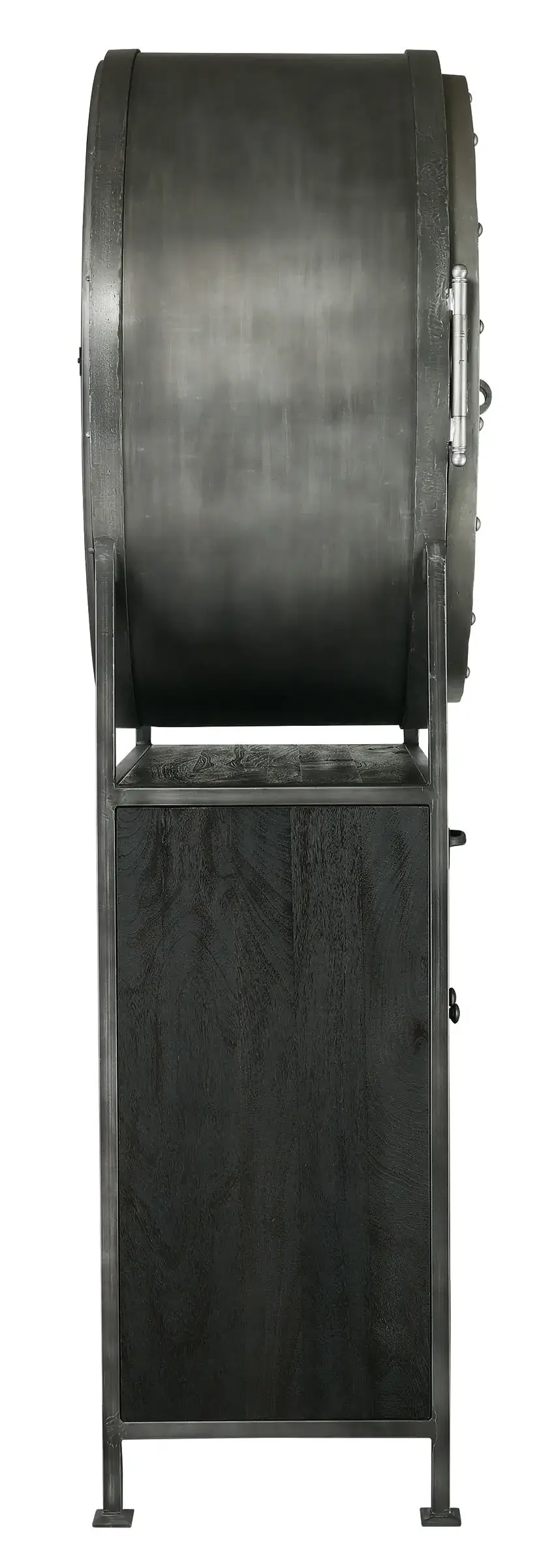 - This porthole bar cabinet features two distinctive, hinged doors with faux rivets, elongated hinges, strap pulls finished in aged silver, and open up to 180°.