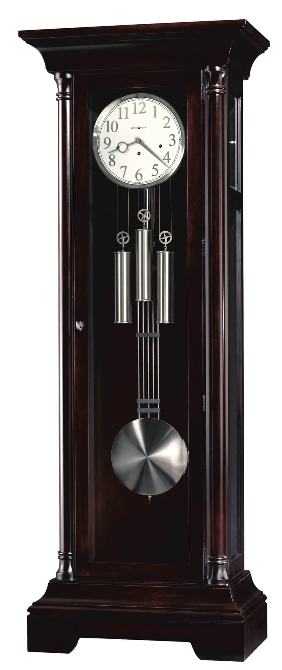 Careful Craftsmanship: With a black coffee finish on select hardwoods and veneers, this classically-inspired grandfather clock makes a grand addition to the Howard Miller Furniture Trend Designs.