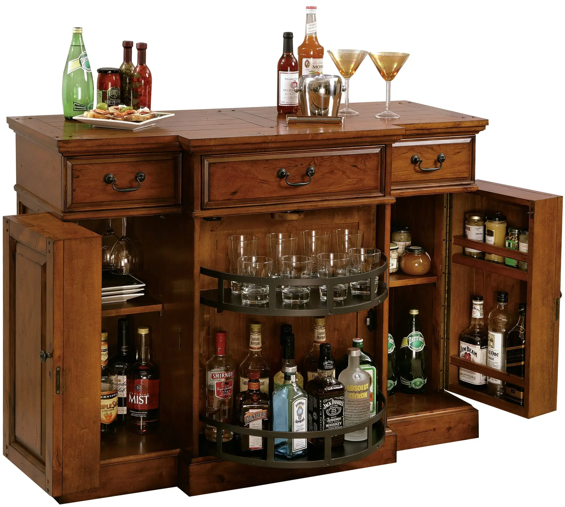 - The center of the cabinet features a revolving door with two fixed shelves providing additional room for bottle and glass storage.