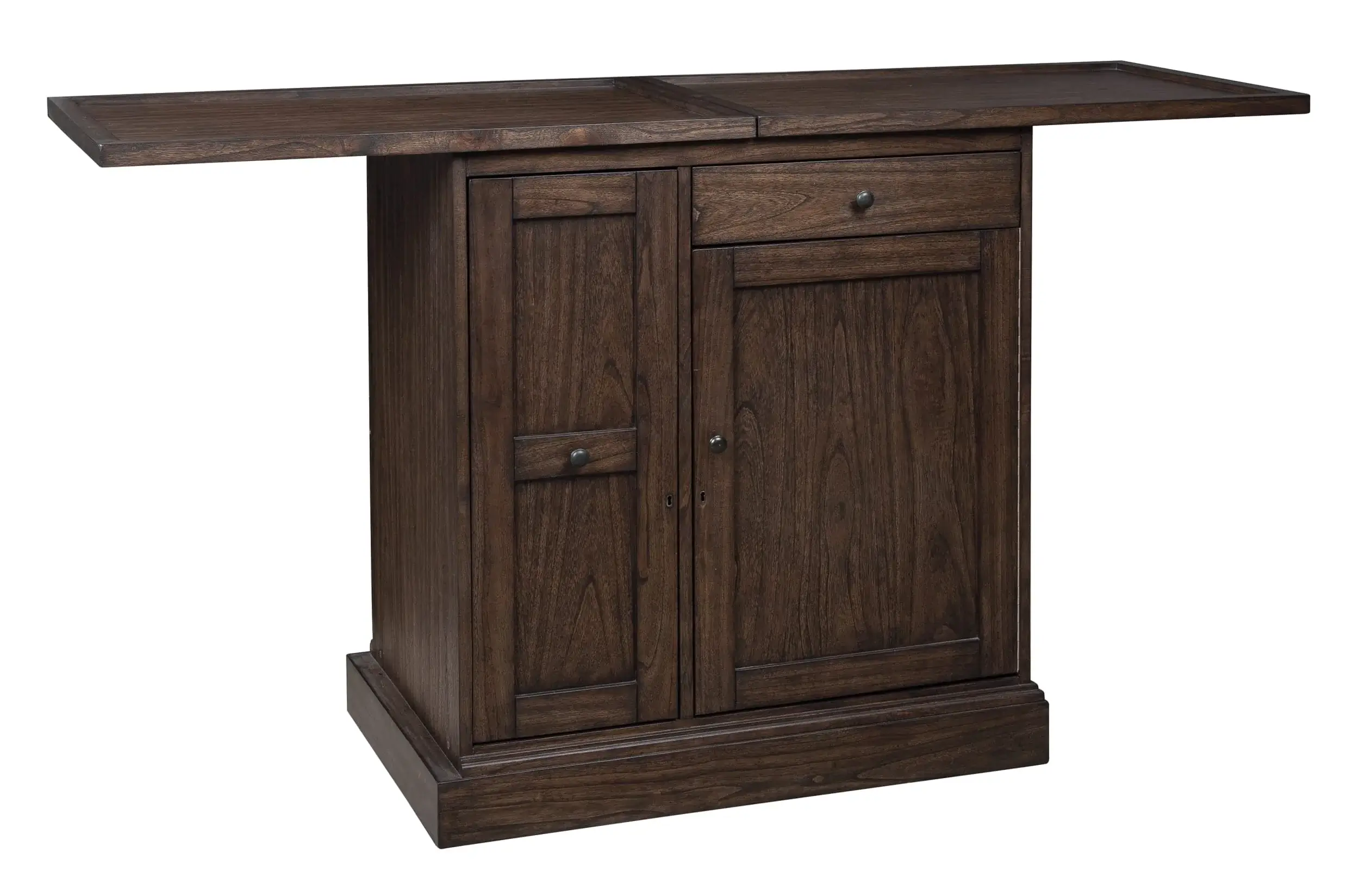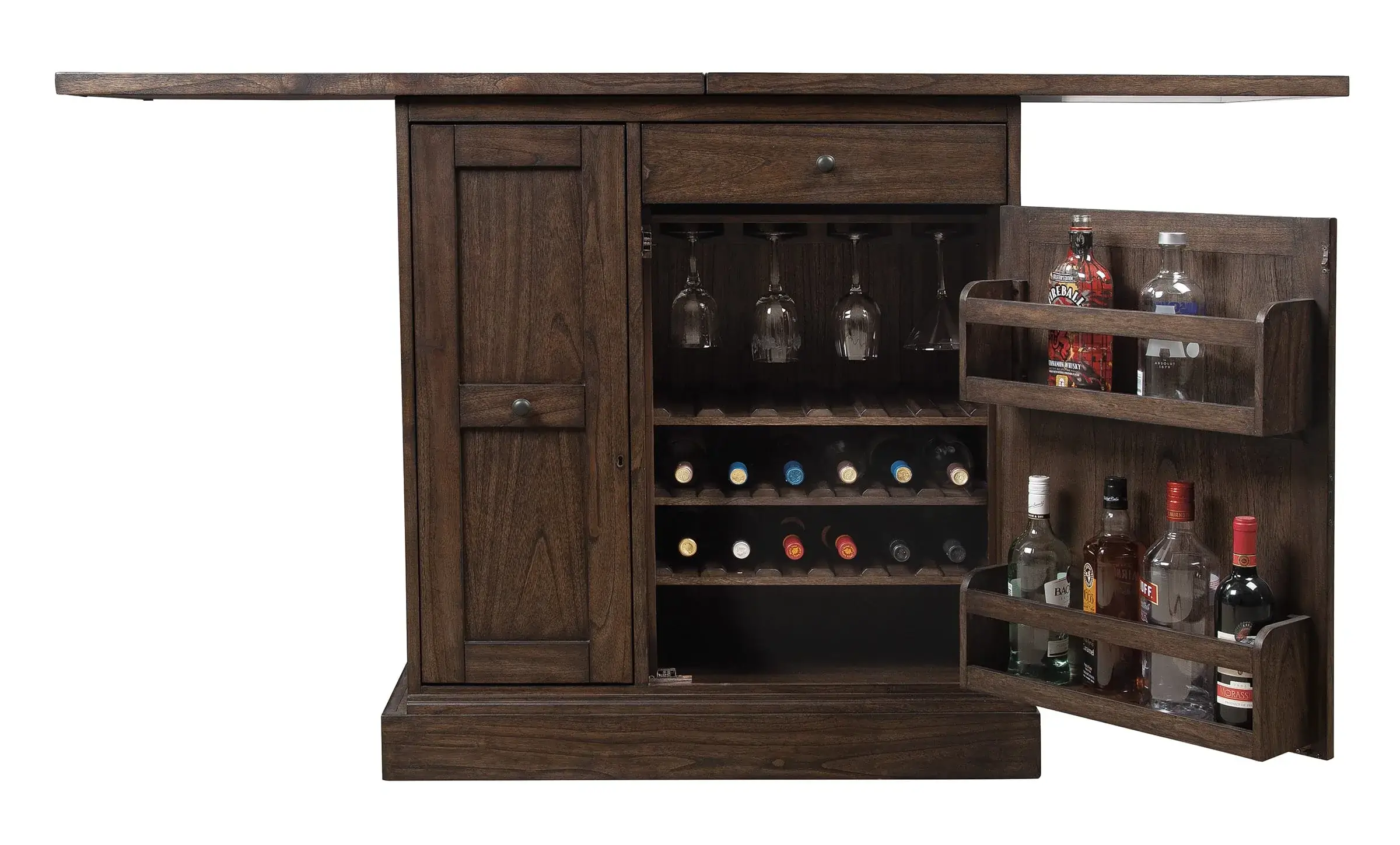 - The locking door with a 180° continuous door hinge includes two liquor storage shelves on the backside.