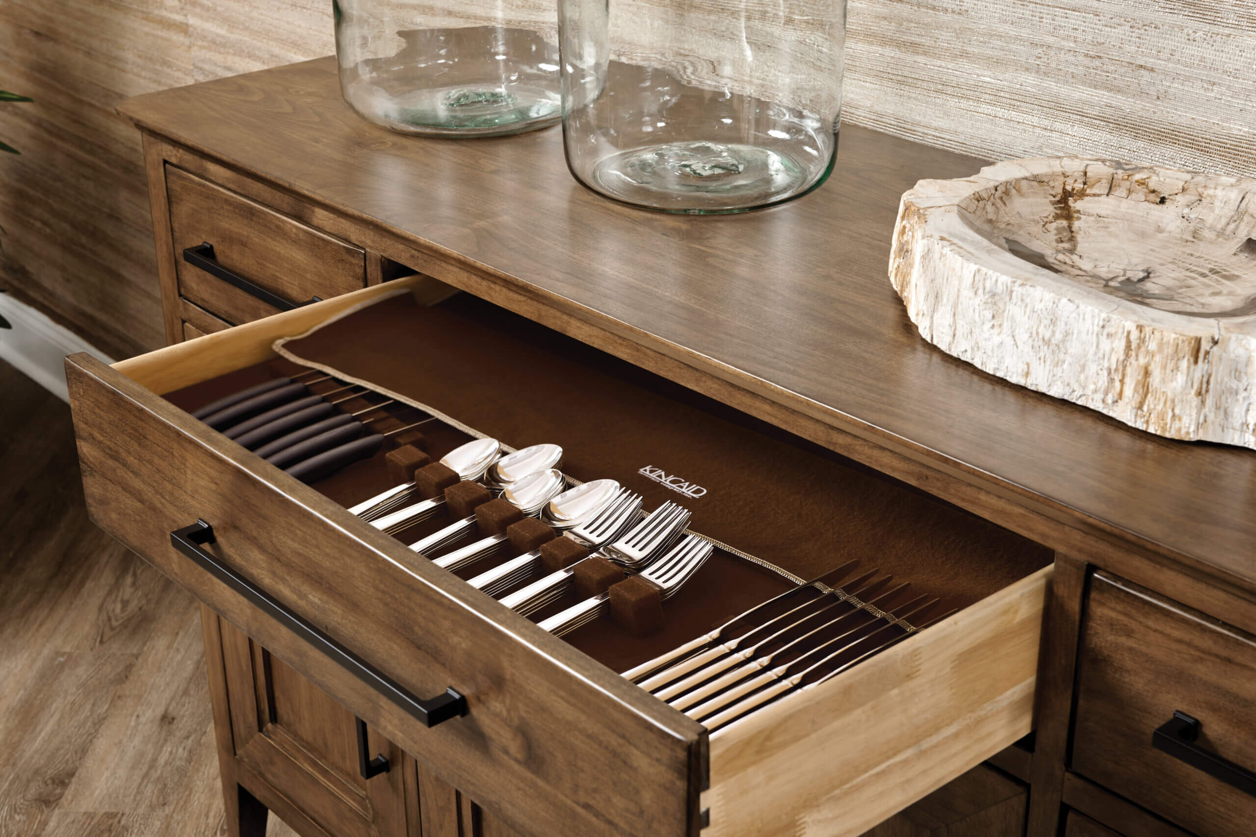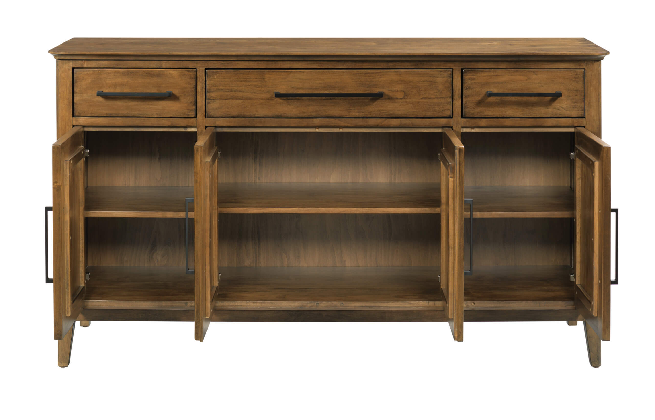 Closed storage remains a top request that we hear from designers and homeowners alike. The Larson Buffet offers flexible storage with three spaces behind the doors and three full depth drawers. Independently adjustable shelves are found behind the three doors.