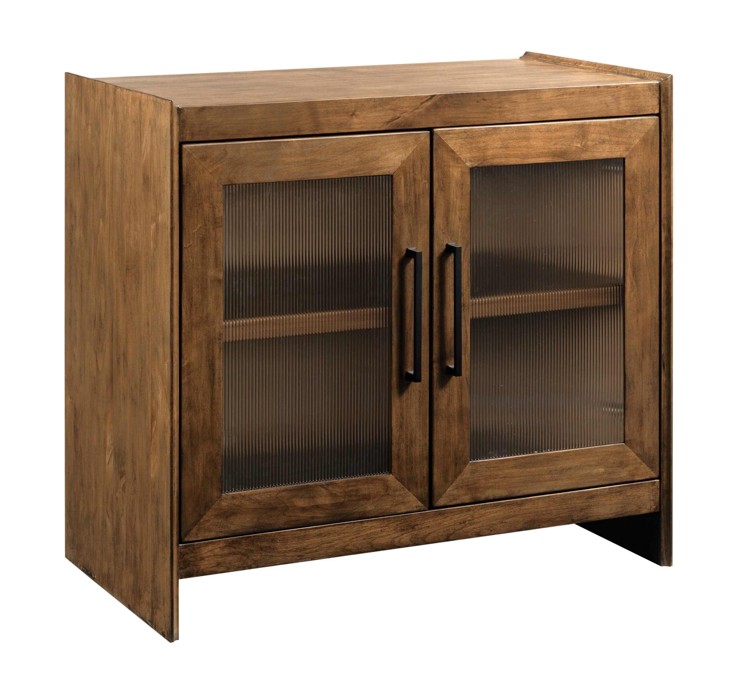 The Wagner Cabinet has a remarkably simple aesthetic for a piece so rich in design elements. Most notably, the two glass doors a fluted and framed in fitted, mitered alder doors. Equally striking is the unique design of the solid wood end panels. They feature a flush panel design with coved edge shaping along the front and top edges. This makes the cabinet perfect for bunching as multiple units or alongside of its longer four-door sibling.