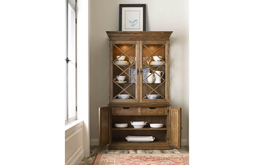 The Mortimer Cabinet is the just-right-sized vertical piece for today’s open living and dining spaces giving the home the functional features of a china cabinet without requiring a large wall. The deck includes curio style tempered glass end panels on the deck portion, two adjustable tempered glass shelves, and recessed touch operated lighting. In the base there are two full depth drawers and one adjustable wood shelf. Built as a separate base and deck, the cabinet can be used as a base only as the base has a finished top.