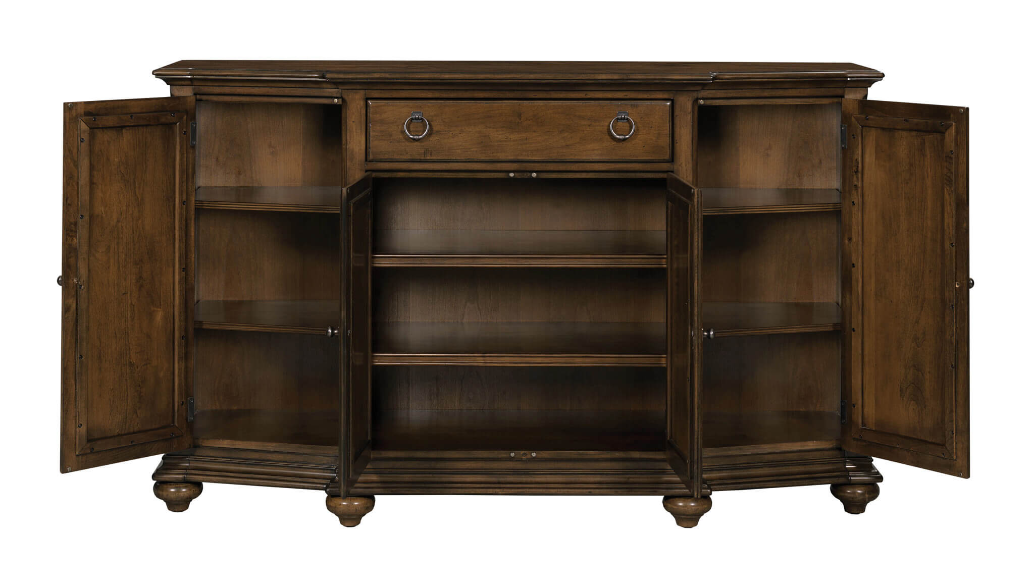 From a styling perspective, the Damian Master Buffet seeks to keep things clean and un-complicated while showcasing the craftsmanship that Kincaid solid wood furniture is known for. It incorporates genuine raised, framed panels in the four doors and in the end panels, offers six adjustable shelves behind the doors, includes a silverware tray in the drawer and is built with solid Alder.