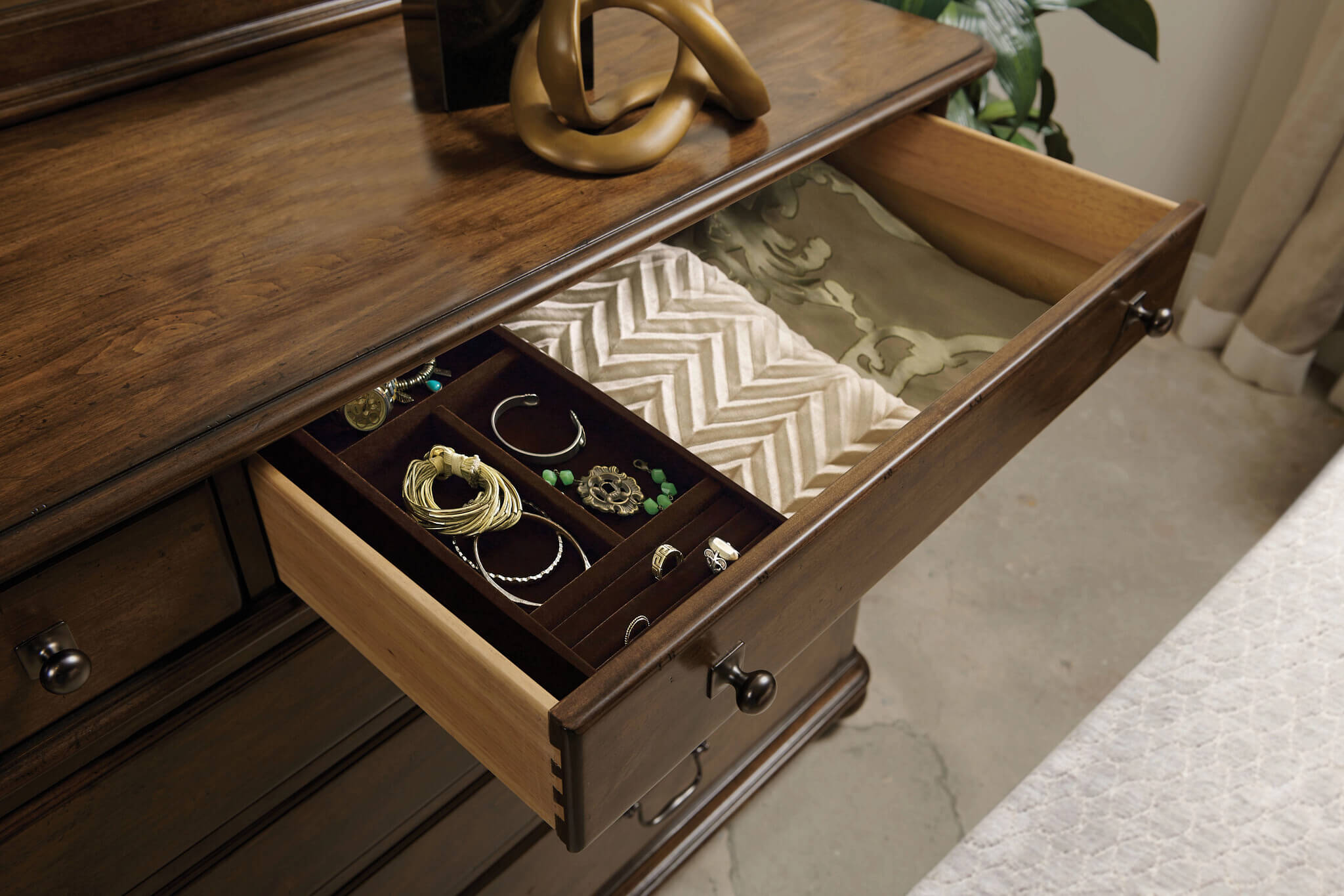 At 66 inches wide and 40 inches tall, the Witham Dresser is the is primary storage piece of the Commonwealth bedroom collection. It is designed with six drawers and two doors to offer a variety of options for keeping things organized. Behind each of the two doors is an adjustable shelf and the top right drawer includes a jewelry tray.
