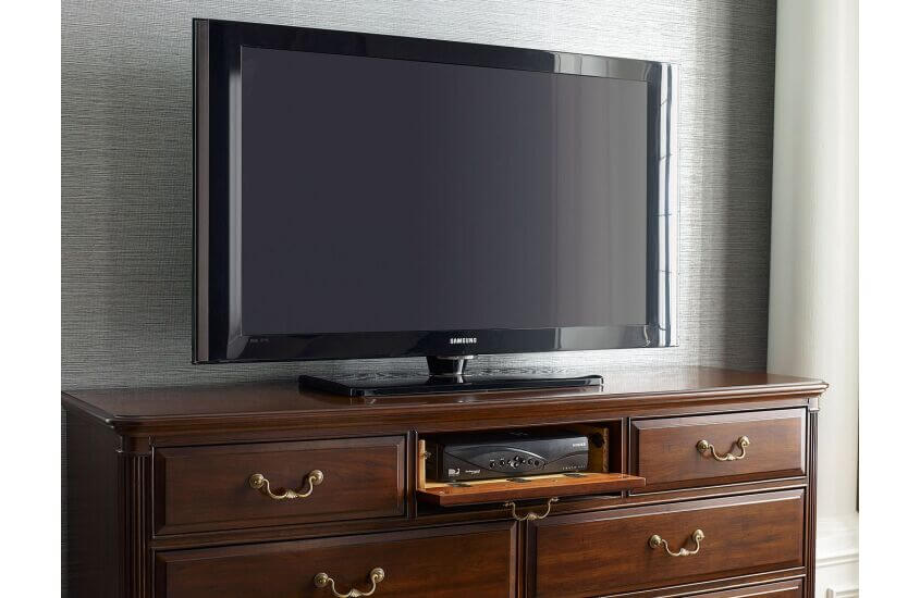 We can’t think of a style that is more timeless than the classical look of Hadleigh. More refined than ever and crafted from American Black Cherry this collection retains the nuanced detail of fine 18th century design without the ornate Queen Anne elements. This updated refresh makes this perfect for a more modern approach to the classical style. The drawer dresser features nine drawers, one of which includes a flip-down front for a media component, while another features a lined jewelry tray.