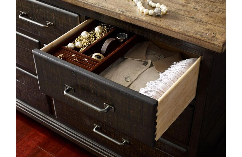 The Farmstead Dresser captures the essence of the Plank Road collection. Inspired by a period in American history when function helped define style, the dresser includes the uneven, solid pine boards on the top and framed end panels. It also features the elongated, custom designed hardware found throughout the collection. The overall look is a casual/vintage character made to last.
