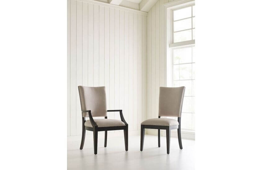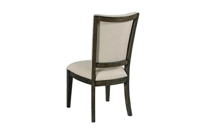 In keeping with the design philosophy of Plank Road, the Howell dining chair balances clean lines with the details of its construction. The solid wood that serves as the structural framework of the chair is exposed and left as part of the beauty of the piece. This makes for a particularly attractive approach view of the back of the chair. It also features a small nail-head trim that frames the seat and back upholstery.
