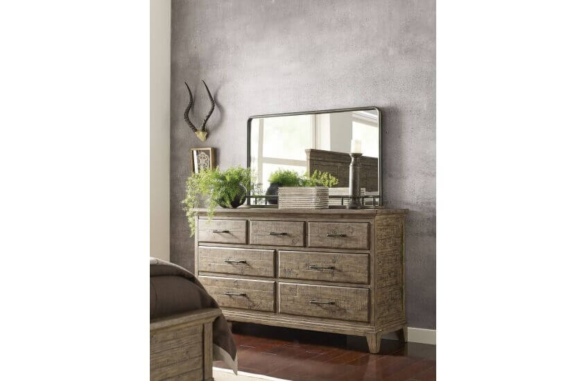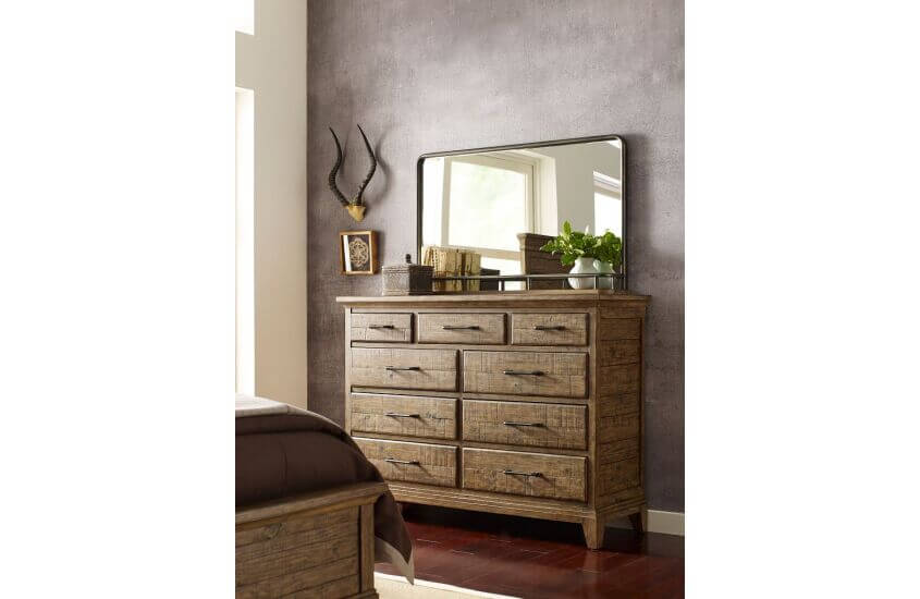 A more eclectic bedroom look can be achieved using the Westwood mirror. Designed to correlate without being too “matched up” this mirror is framed in a metal tubing motif and includes a wood tray along the front.