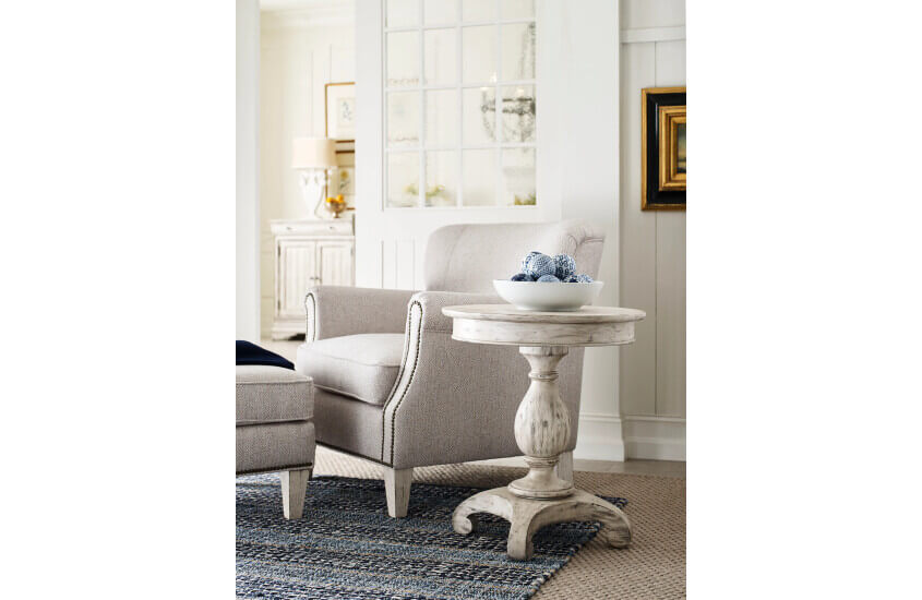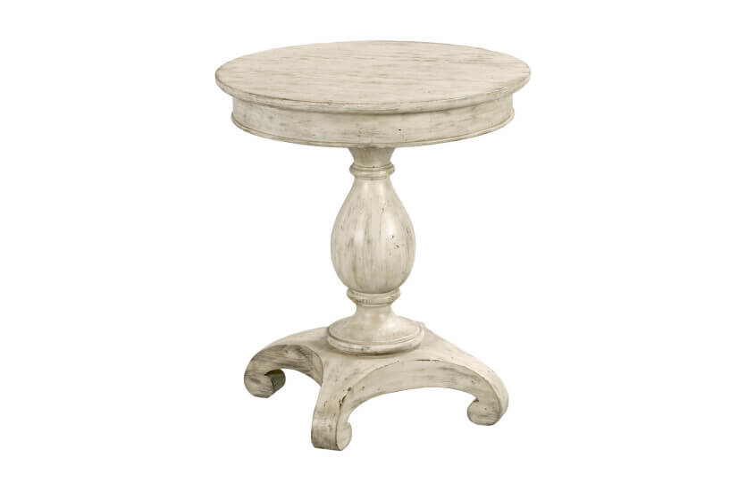 Rarely does a small piece of furniture make as big of an impact in a space as the Kelsey Round End Table. This accent table is as well suited beside a stand alone chair in the bedroom or office as it is flanking the sofa in the living room. Made of solid wood, the turned pedestal style and worn antiqued finish m