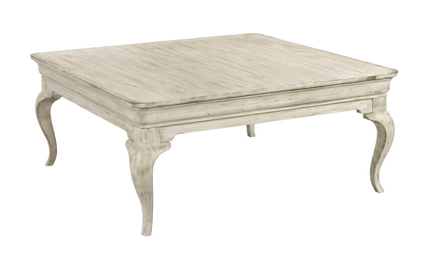 The Kelsey Coffee Table is designed around the classic French Cabriole leg. Shown here in the square format, the graceful curves of the leg seem to naturally extend from the soft radius of the top on this solid wood coffee table. As an added benefit, the cottage white finish and solid wood construction make this an excellent choice for active homes as the antiqued character of the finish and solid wood materials offer a little more grace when the normal bumps and bruises of a living space are encountered.