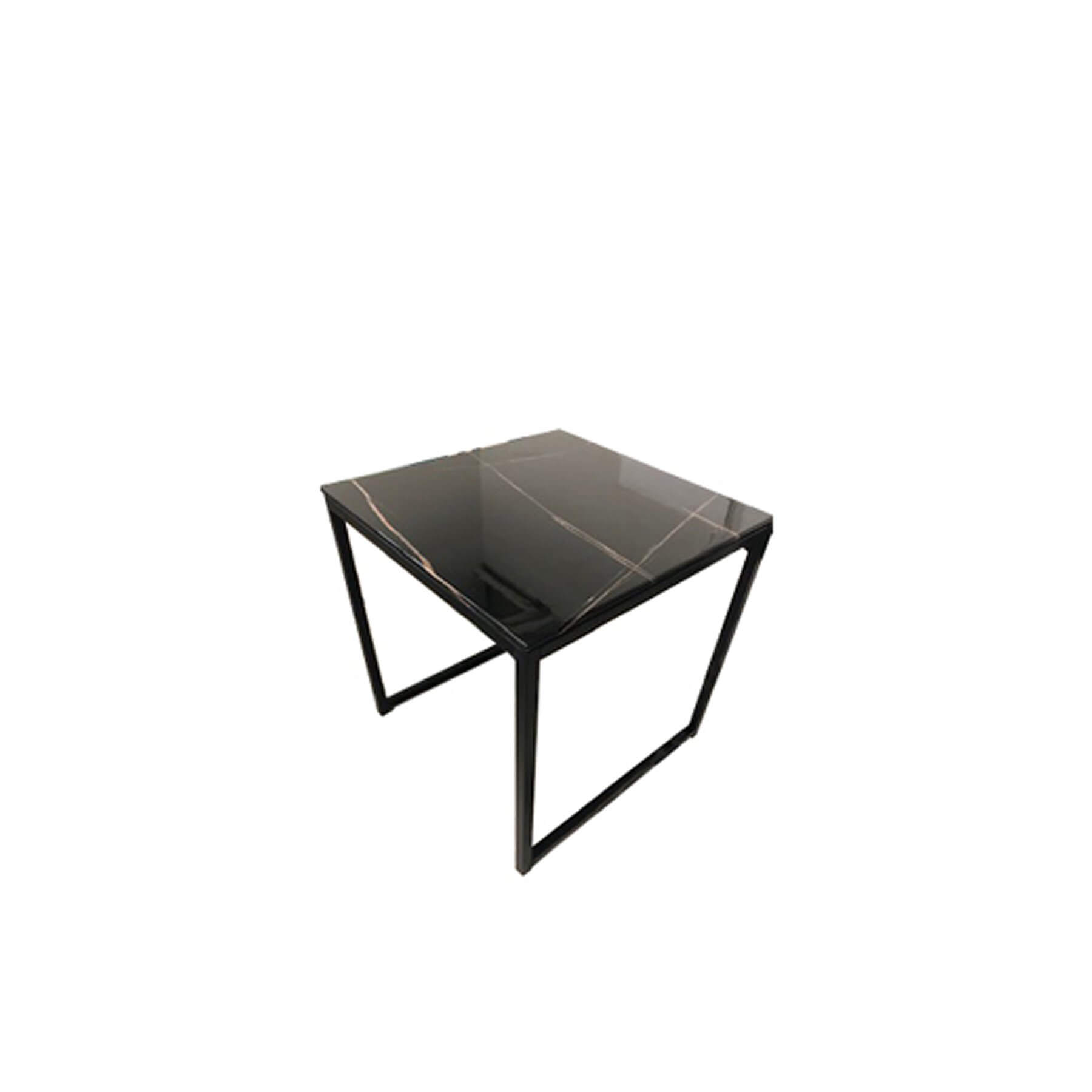 Bruno End Table. Simple shapes and a minimalist metal frame make this piece ideal for a modern interior. Versatile enough for casual and classic rooms, too. Aesthetically pleasing, this table draw its beauty from its simple forms and geometric lines producing an uncomplicated, harmonious architecture. The black marble glass top is gracefully supported by a slender yet sturdy powder coated black base. Despite its simplicity, it allows for a personal approach that leaves room for a variety of subtlety.