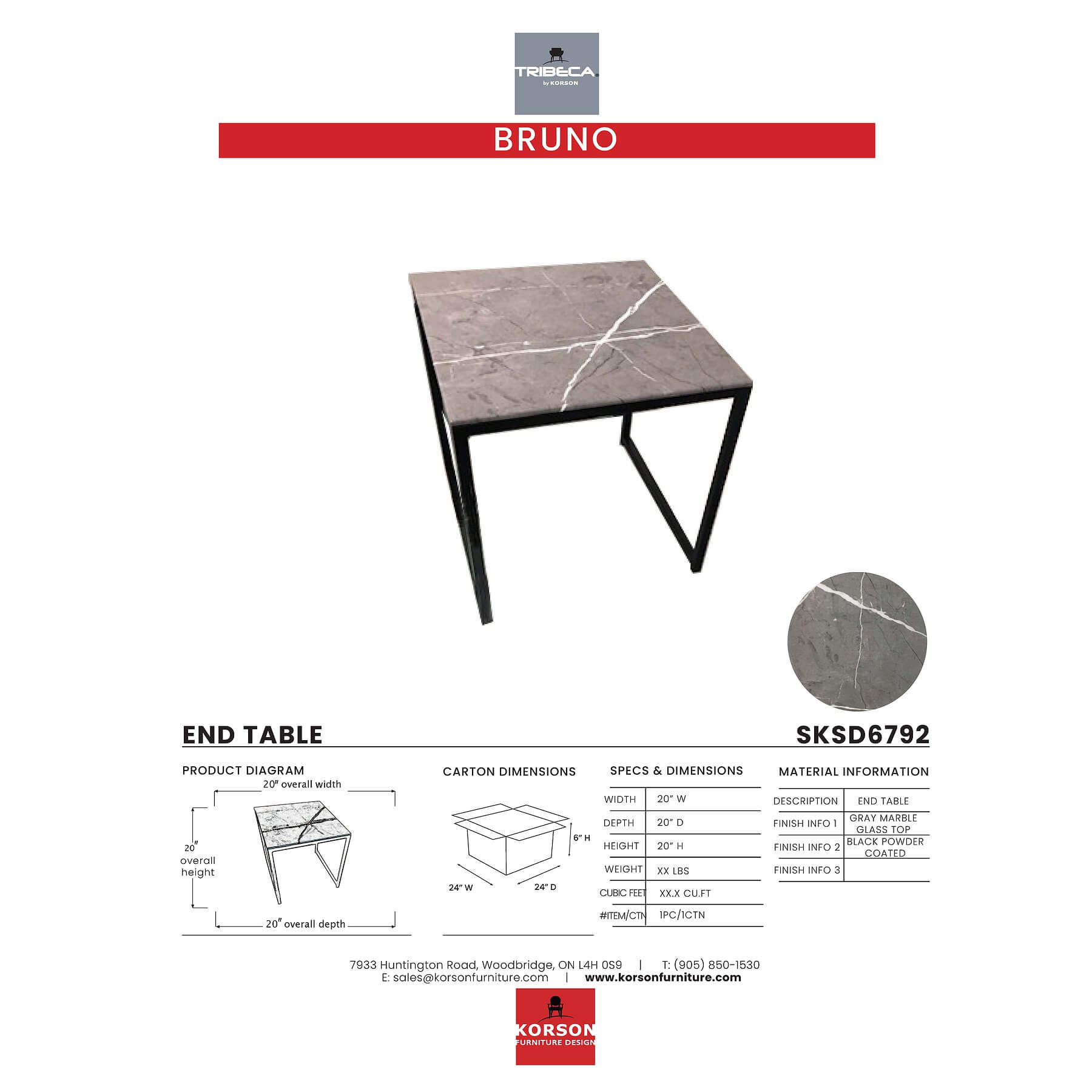 Bruno End Table. Simple shapes and a minimalist metal frame make this piece ideal for a modern interior. Versatile enough for casual and classic rooms, too. Aesthetically pleasing, this table draw its beauty from its simple forms and geometric lines producing an uncomplicated, harmonious architecture. The gray marble glass top is gracefully supported by a slender yet sturdy powder coated black base. Despite its simplicity, it allows for a personal approach that leaves room for a variety of subtlety.
