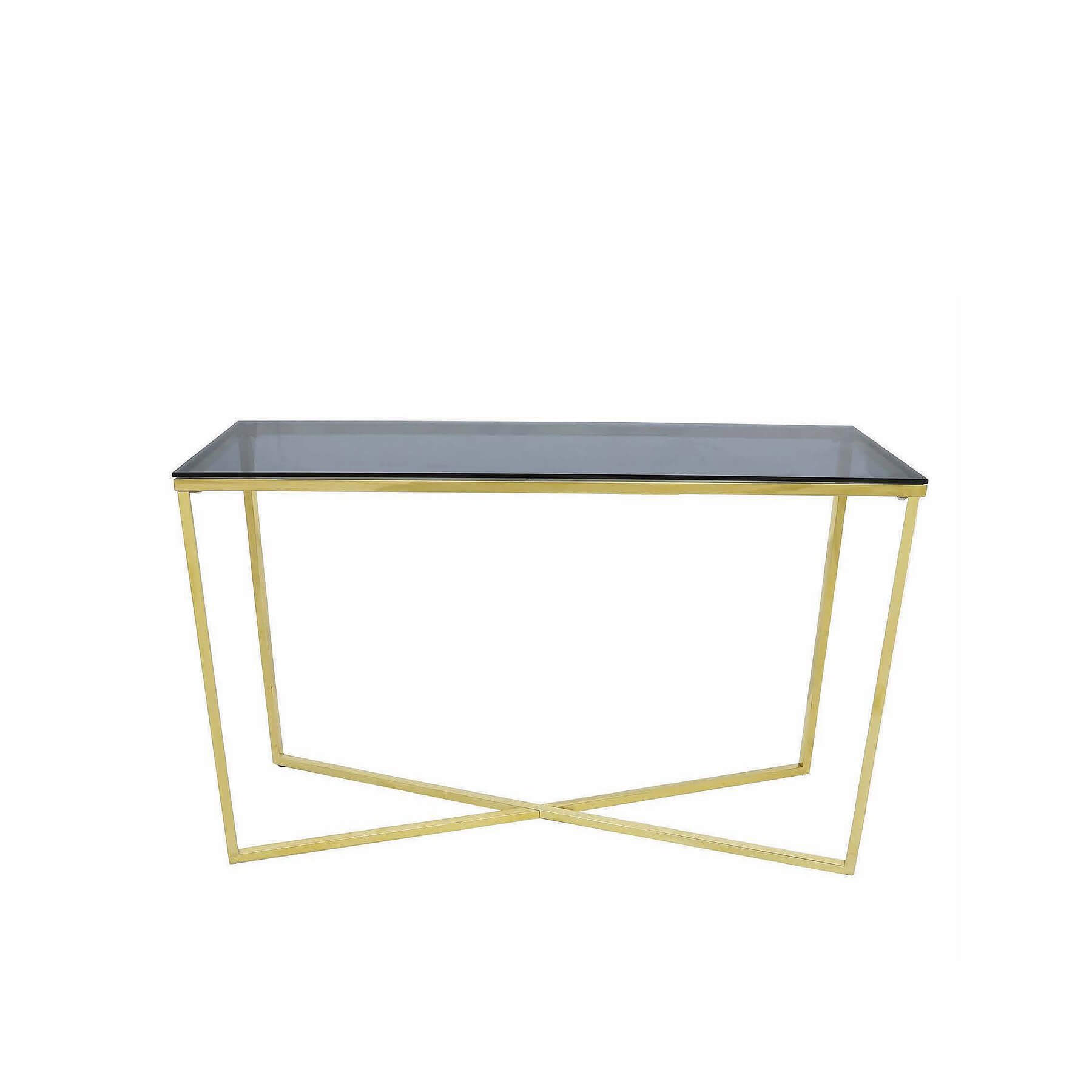 Nash Console Table. With crisp, clean lines and sophisticated, minimalist design, the Nash collection is the epitome of ultra modern style. Features an x-shaped base that gives the piece its modern edge. A gold plated stainless finish gives the base a radiant glow while a gray/blue glass top adds elegant contrast to the tough, sturdy frame. The collection exudes a commanding presence, making it the perfect centerpiece to an ultra contemporary living room.