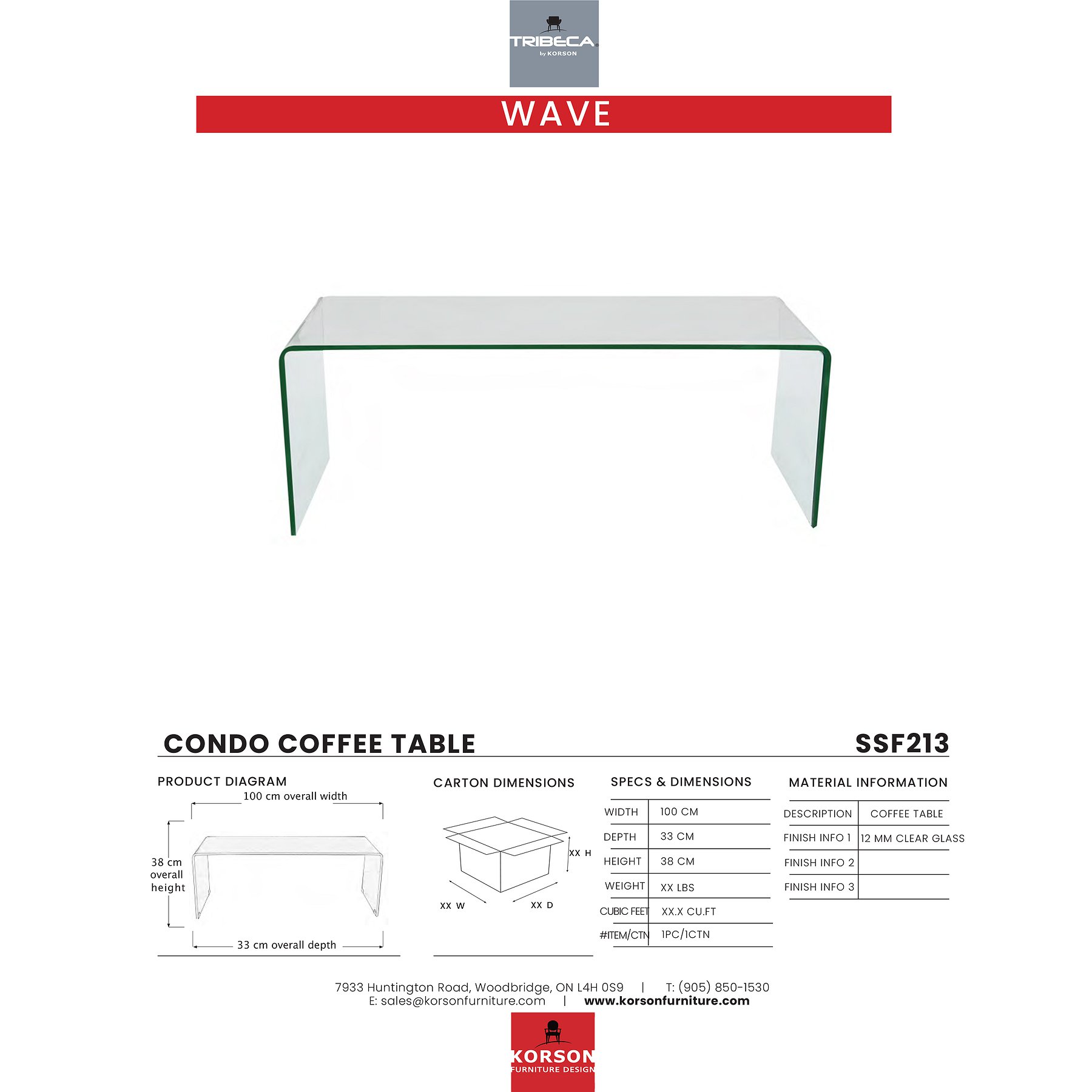 Wave Condo Coffee Table. Simple shapes make this piece ideal for a modern interior. Versatile enough for casual and classic rooms, too. Aesthetically pleasing, this table draws its beauty from its simple forms and geometric lines producing an uncomplicated, harmonious architecture. Guaranteed to add visual interest to any living room! The 12 mm clear glass enhances the surrounding atmosphere, making your room appear more spacious.