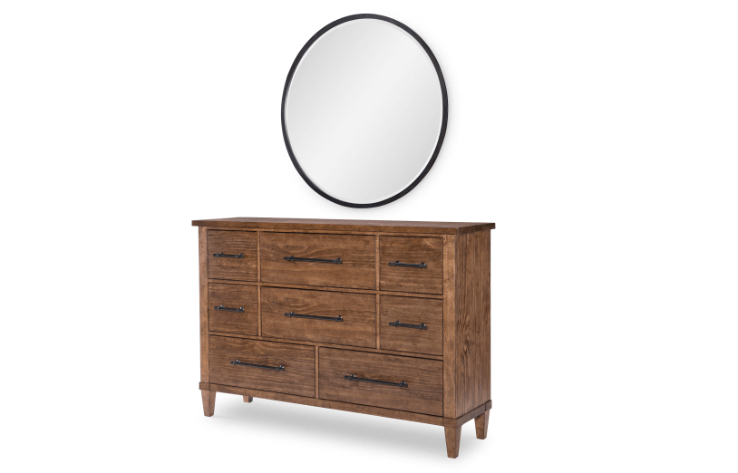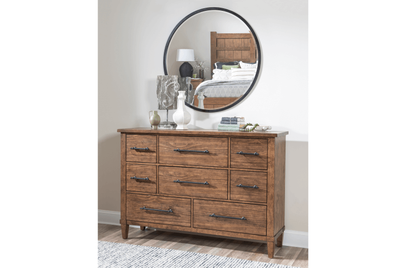 Artisan’s Place by Legacy Classic |Modern redefines farmhouse style with an eclectic two-toned whole home collection. Featuring mixed media and some Craftsman design elements, the 35-piece collection is constructed of Hardwood Solids and Pine Veneers. The main finish is the clean and refined Rustic Buff, accented by black bases and hardware, a black accent finish on selected pieces and mixed media including stone and metal. Several cabinet fronts in the eclectic farmhouse design feature metal lattice grill on the doors. While some tables have chunky legs, others have tapered legs and urn-shaped bases.