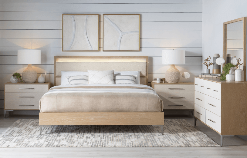 Capture a modern resort feeling with the Biscayne Collection by Legacy Classic | Modern. A light and airy blonde Malabar finish is paired with faux linen-wrapped Alabaster door and drawer fronts and mixed materials to create a serene and stylish setting. Crafted of Quartered Oak Veneers and Hardwoods, the collection offers a clean, fresh aesthetic expressed through organic elements and surface dimension. Design details include pierced and basket weave fronts on cabinets, Travertine Marble insets, silver metal accents and tapered legs, geometric motifs and matte nickel hardware. The 30-piece collection features bedroom, dining, accents, occasional, home office and home entertainment furniture. A signature poster bed has a stunning matte nickel metal canopy that attaches to the upholstered headboard, which has touch lighting at the top for an inviting ambience.