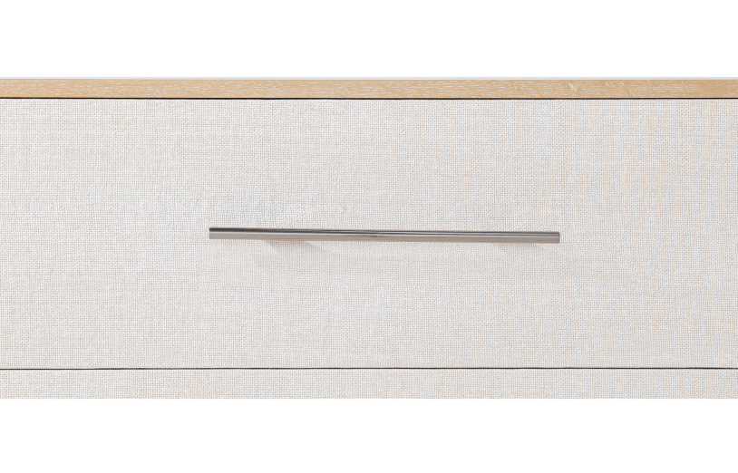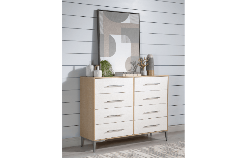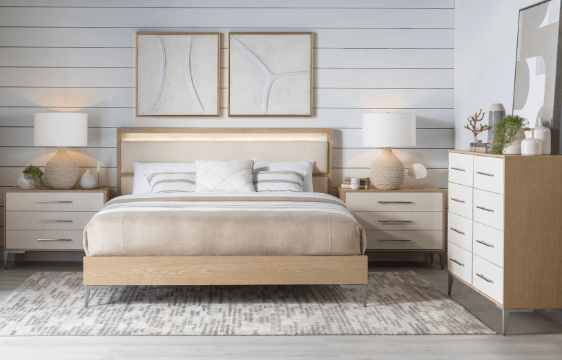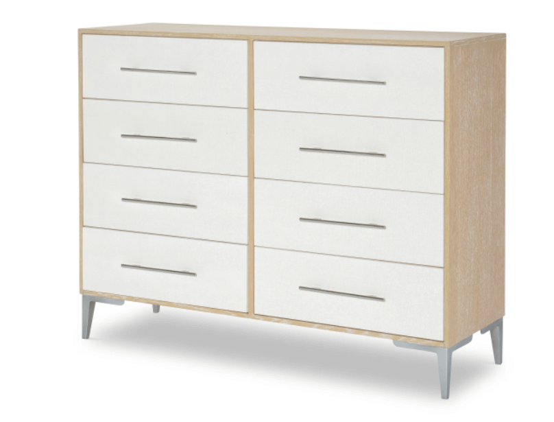 Capture a modern resort feeling with the Biscayne Collection by Legacy Classic | Modern. A light and airy blonde Malabar finish is paired with faux linen-wrapped Alabaster door and drawer fronts and mixed materials to create a serene and stylish setting. Crafted of Quartered Oak Veneers and Hardwoods, the collection offers a clean, fresh aesthetic expressed through organic elements and surface dimension. Design details include pierced and basket weave fronts on cabinets, Travertine Marble insets, silver metal accents and tapered legs, geometric motifs and matte nickel hardware. The 30-piece collection features bedroom, dining, accents, occasional, home office and home entertainment furniture. A signature poster bed has a stunning matte nickel metal canopy that attaches to the upholstered headboard, which has touch lighting at the top for an inviting ambience.