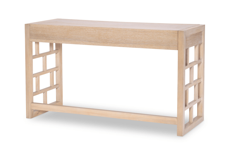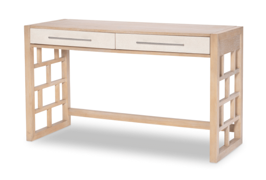 Capture a modern resort feeling with the Biscayne Collection by Legacy Classic | Modern. A light and airy blonde Malabar finish is paired with faux linen-wrapped Alabaster door and drawer fronts and mixed materials to create a serene and stylish setting. Crafted of Quartered Oak Veneers and Hardwoods, the collection offers a clean, fresh aesthetic expressed through organic elements and surface dimension. Design details include pierced and basket weave fronts on cabinets, Travertine Marble insets, silver metal accents and tapered legs, geometric motifs and matte nickel hardware. The 30-piece collection features bedroom, dining, accents, occasional, home office and home entertainment furniture. A signature poster bed has a stunning matte nickel metal canopy that attaches to the upholstered headboard, which has touch lighting at the top for an inviting ambience.