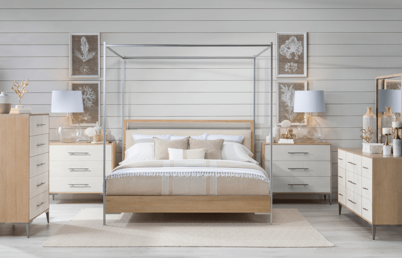 Capture a modern resort feeling with the Biscayne Collection by Legacy Classic | Modern. A light and airy blonde Malabar finish is paired with faux linen-wrapped Alabaster door and drawer fronts and mixed materials to create a serene and stylish setting. Crafted of Quartered Oak Veneers and Hardwoods, the collection offers a clean, fresh aesthetic expressed through organic elements and surface dimension. Design details include pierced and basket weave fronts on cabinets, Travertine Marble insets, silver metal accents and tapered legs, geometric motifs and matte nickel hardware. The 30-piece collection features bedroom, dining, accents, occasional, home office and home entertainment furniture. A signature poster bed has a stunning matte nickel metal canopy that attaches to the upholstered headboard, which has touch lighting at the top for an inviting ambience.