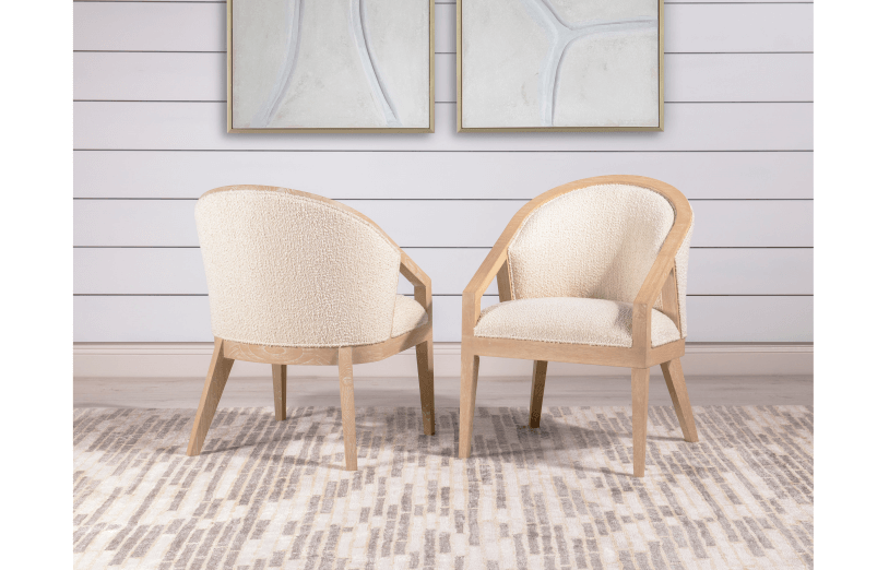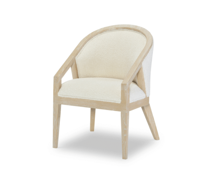 Capture a modern resort feeling with the Biscayne Collection by Legacy Classic | Modern. A light and airy blonde Malabar finish is paired with faux linen-wrapped Alabaster door and drawer fronts and mixed materials to create a serene and stylish setting. Crafted of Quartered Oak Veneers and Hardwoods, the collection offers a clean, fresh aesthetic expressed through organic elements and surface dimension. Design details include pierced and basket weave fronts on cabinets, Travertine Marble insets, silver metal accents and tapered legs, geometric motifs and matte nickel hardware. The 30-piece collection features bedroom, dining, accents, occasional, home office and home entertainment furniture. A signature poster bed has a stunning matte nickel metal canopy that attaches to the upholstered headboard, which has touch lighting at the top for an inviting ambience.